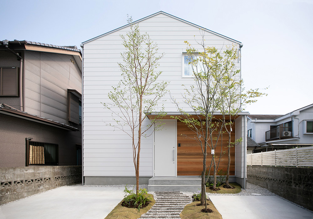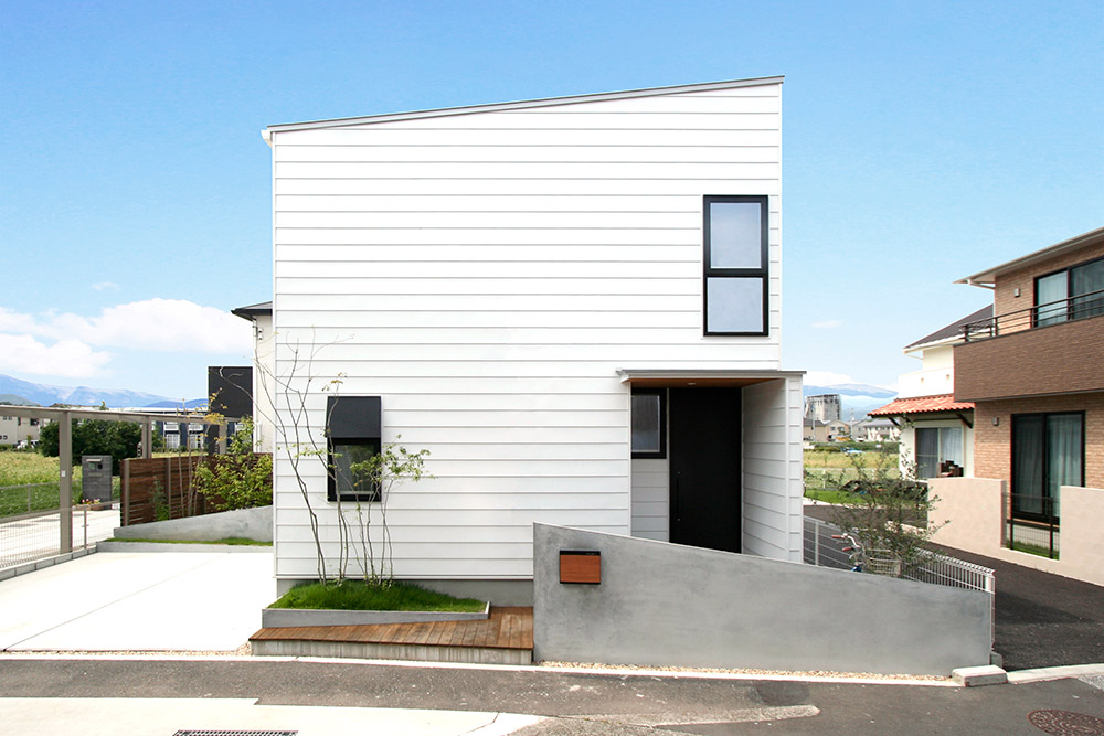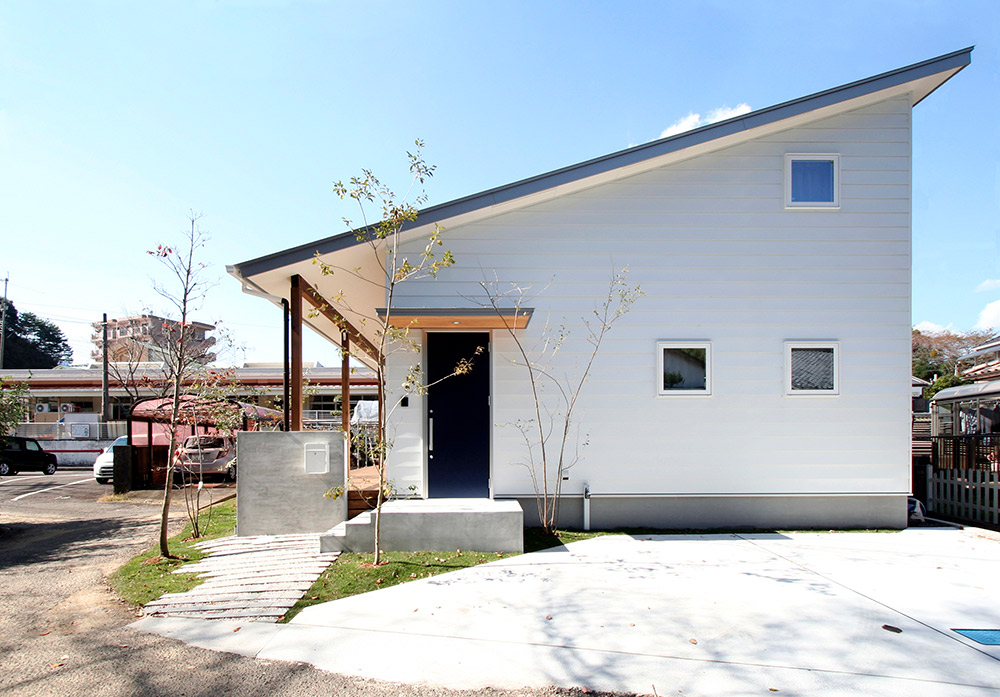 道路側からは三角屋根、玄関側からはスクエアに見える、どちらからも素敵な外観が楽しめる家。