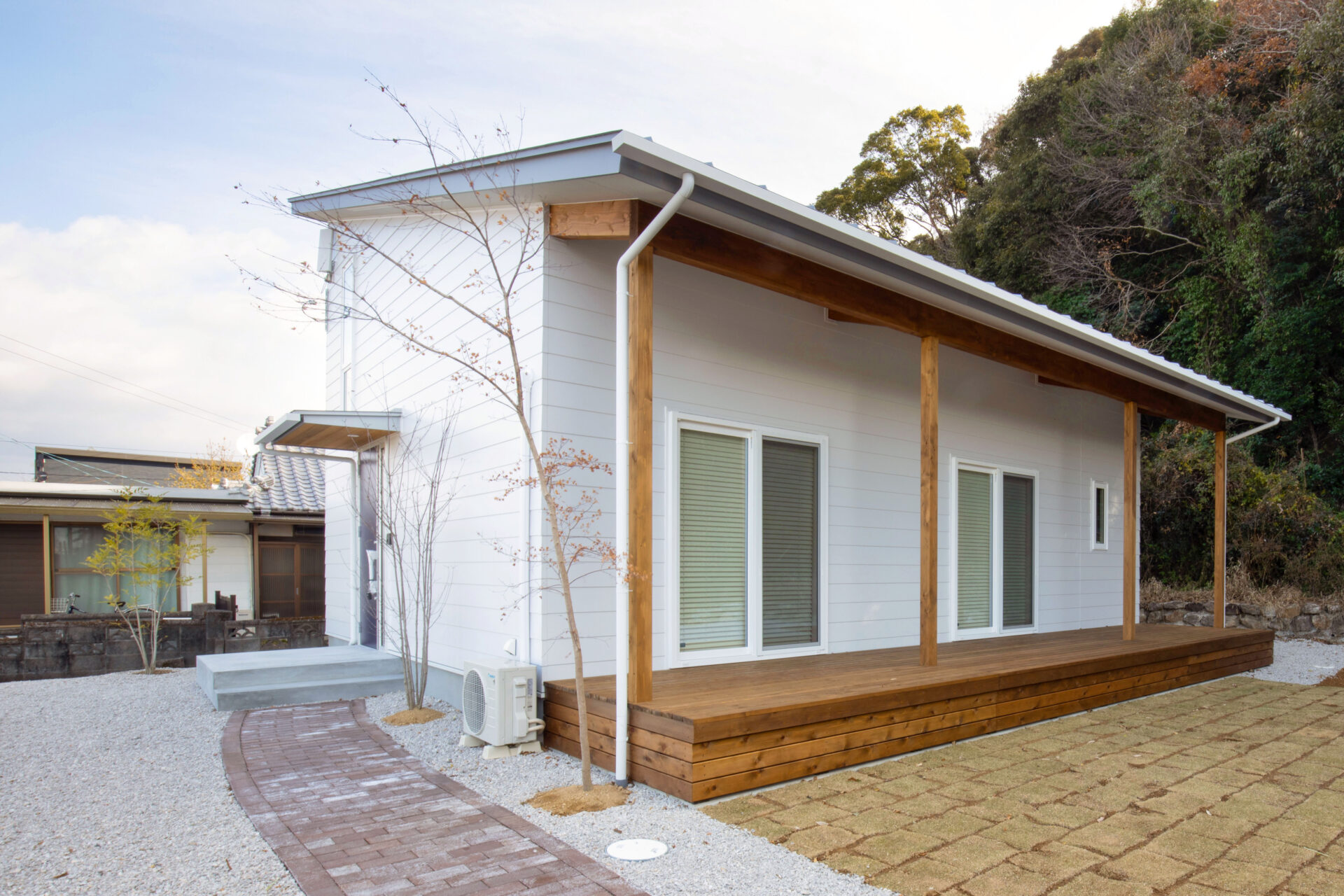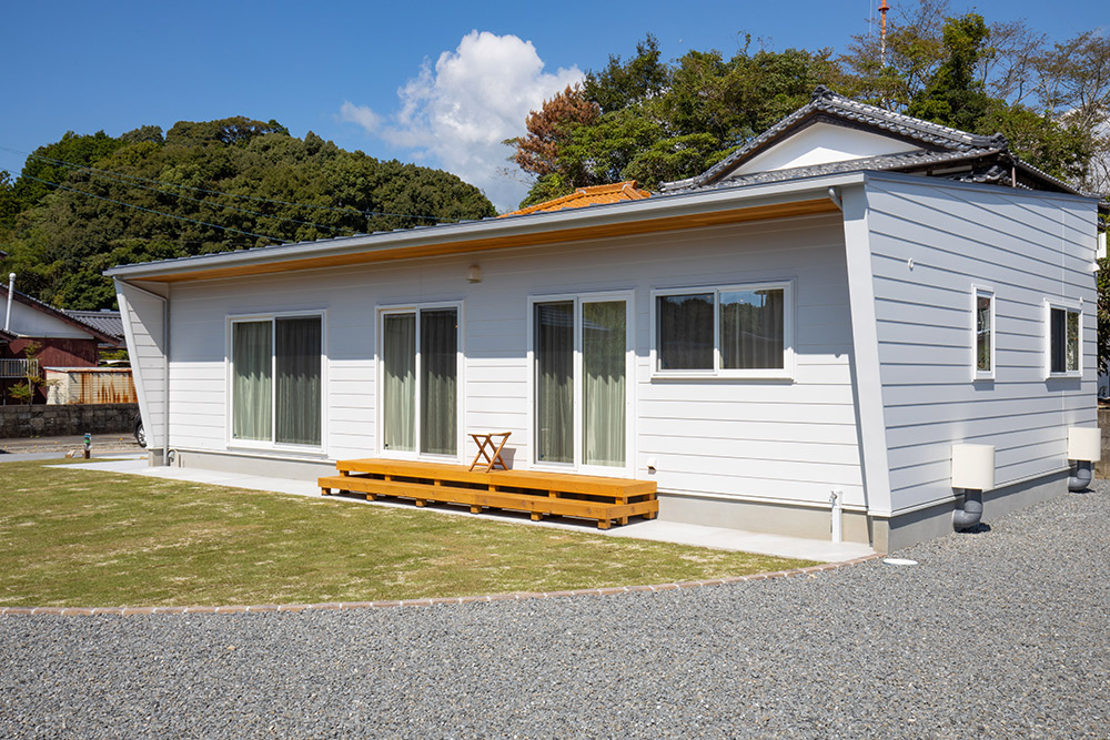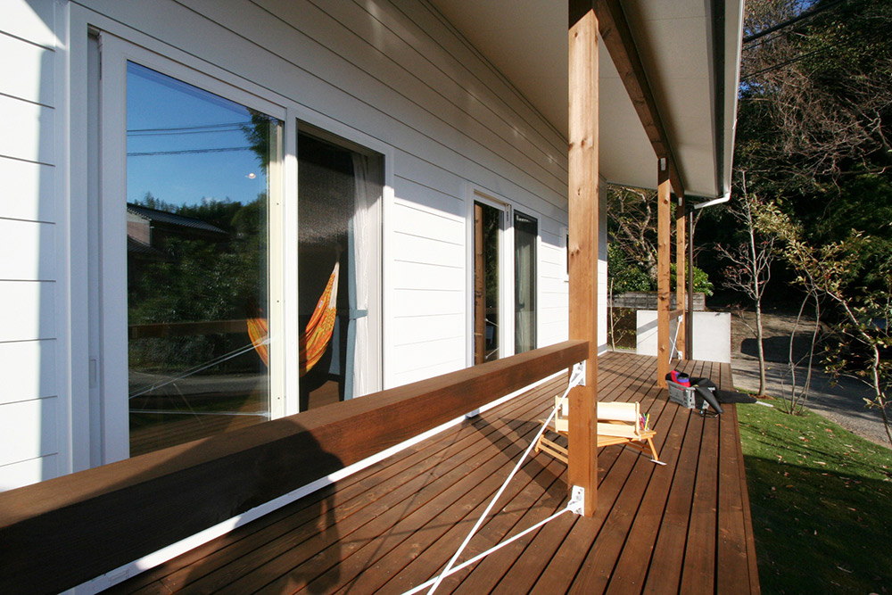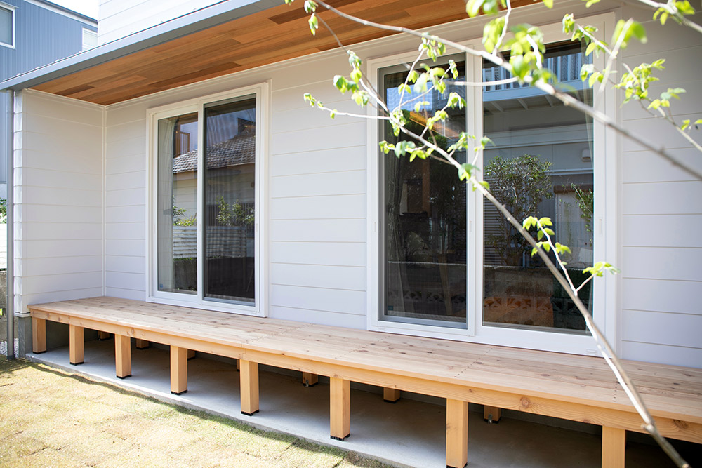 庭面に広がるウッドデッキが印象的な家。ナチュラルな雰囲気の明るい室内は解放感抜群。