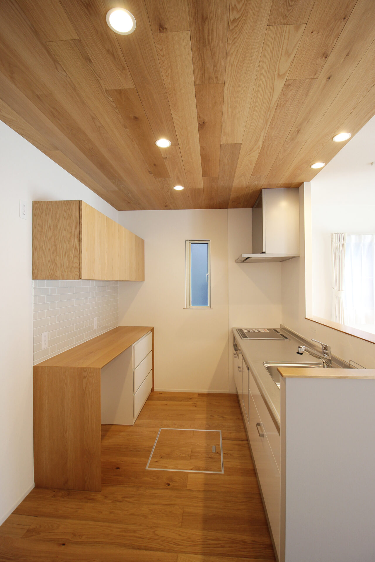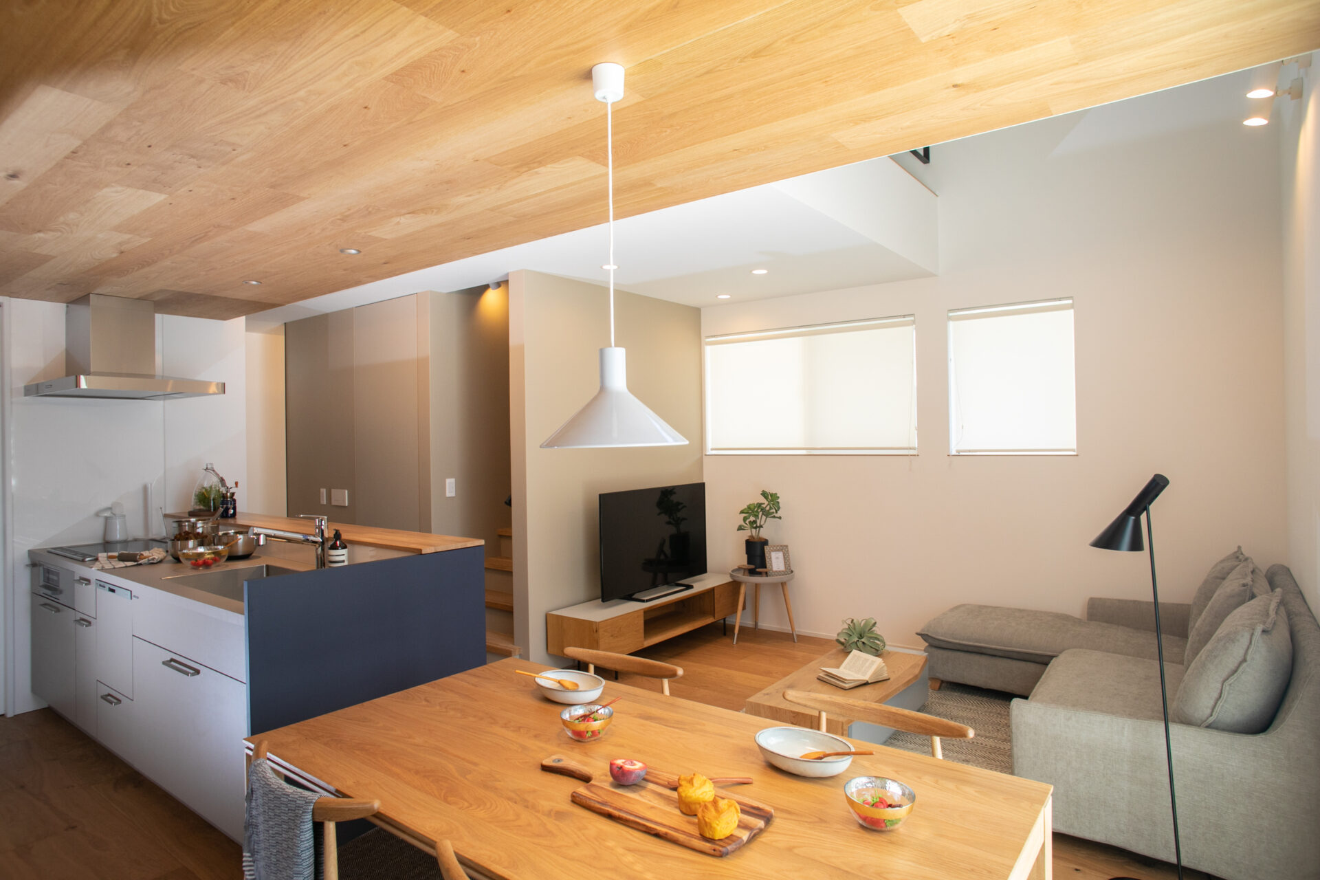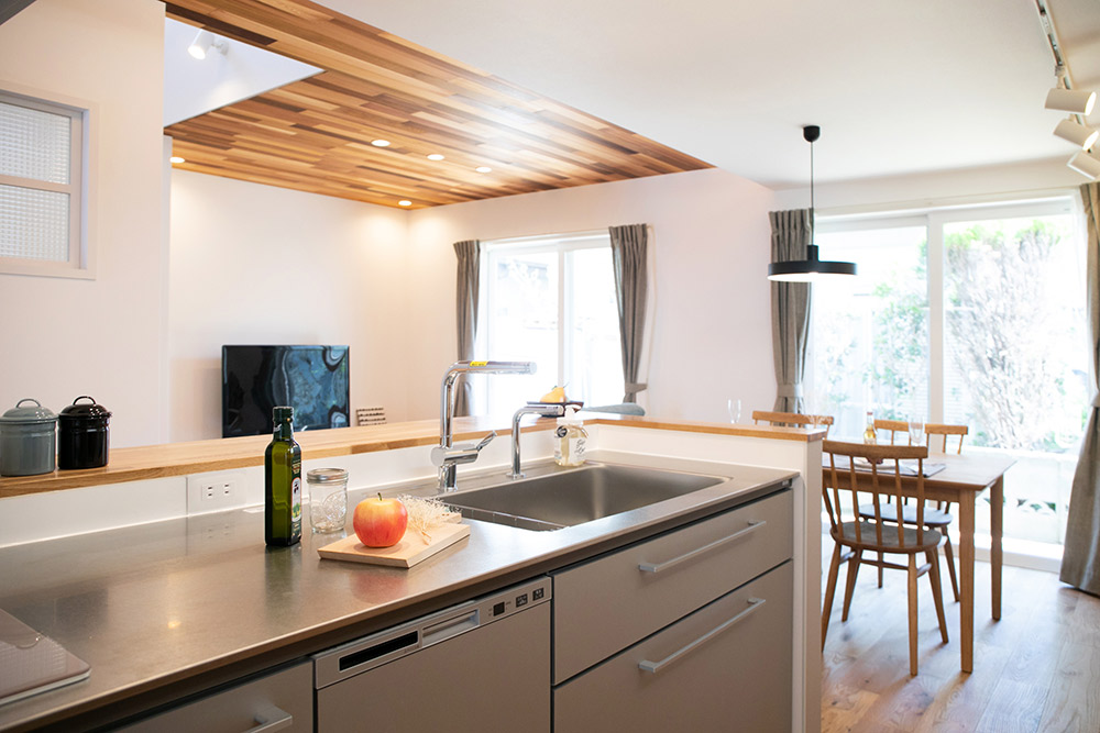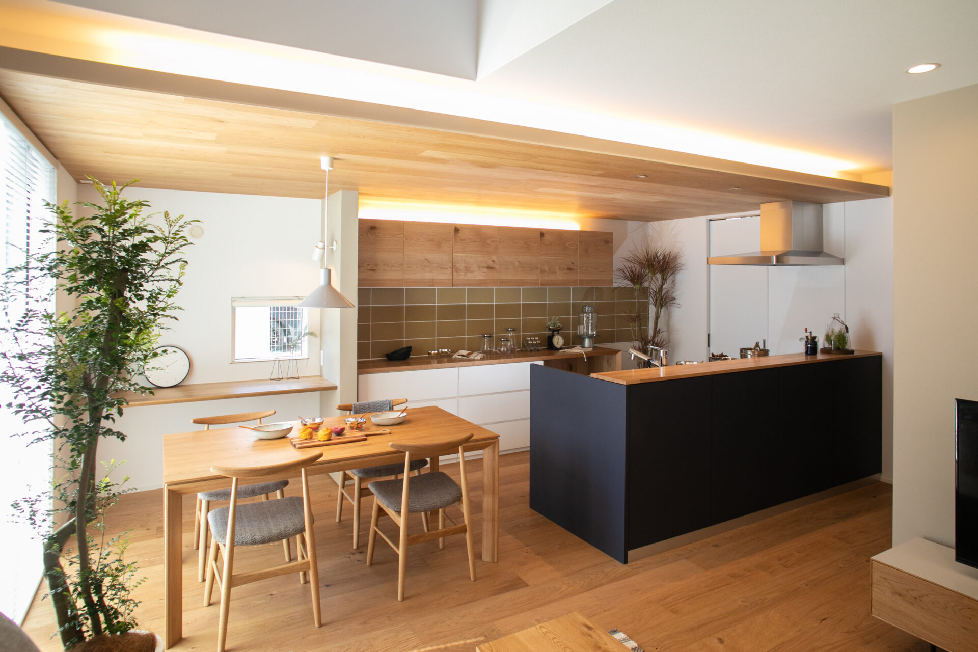 板張りの天井に間接照明が映えるオシャレなダイニングキッチン。