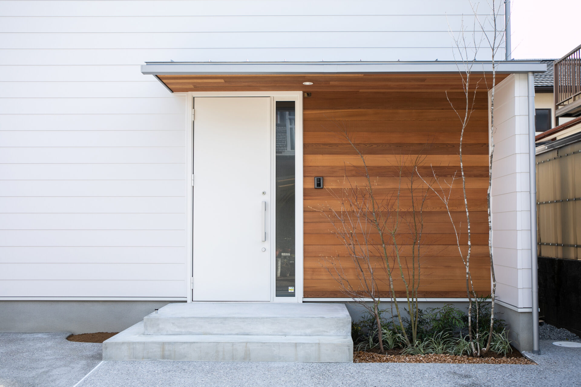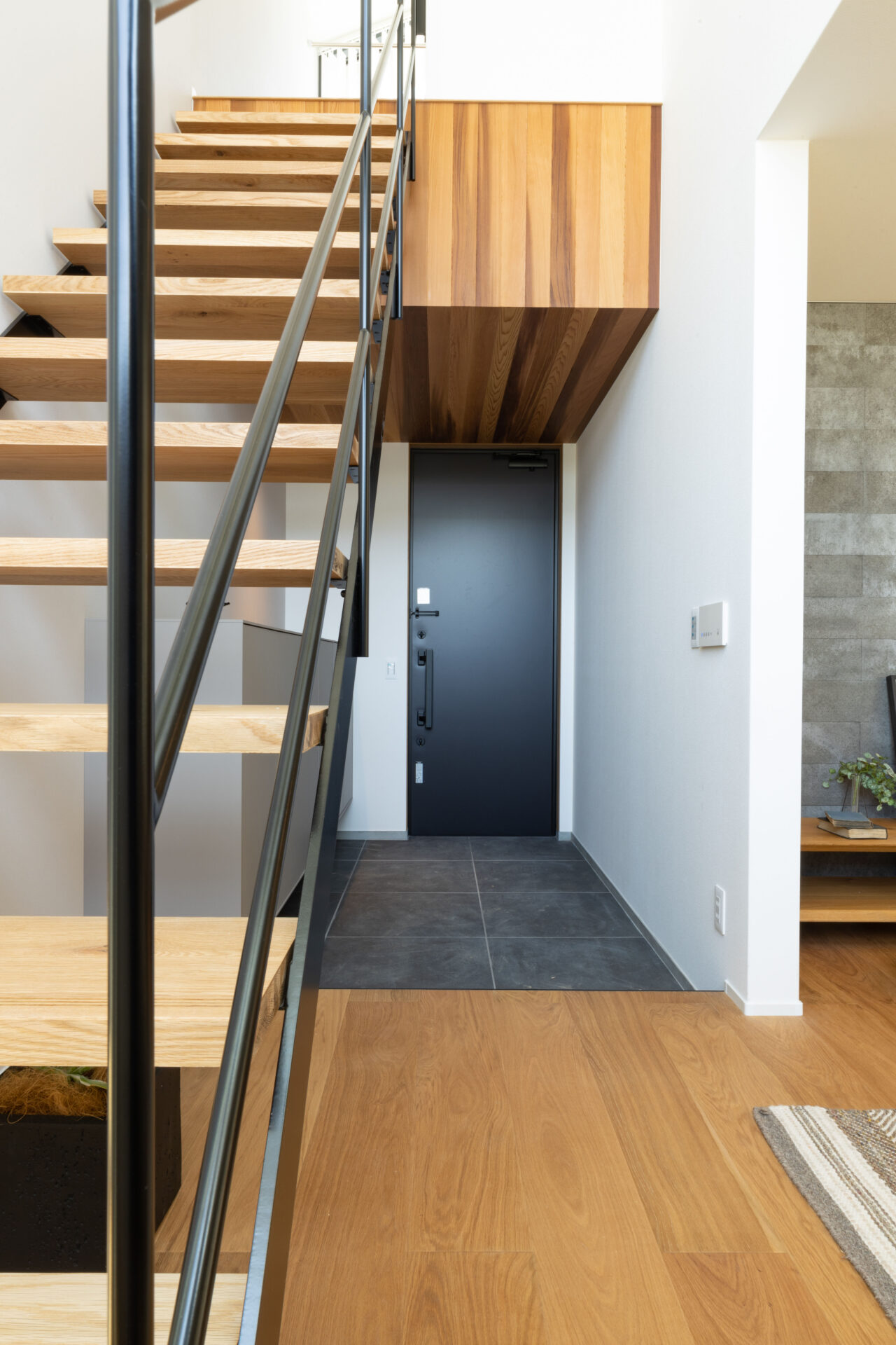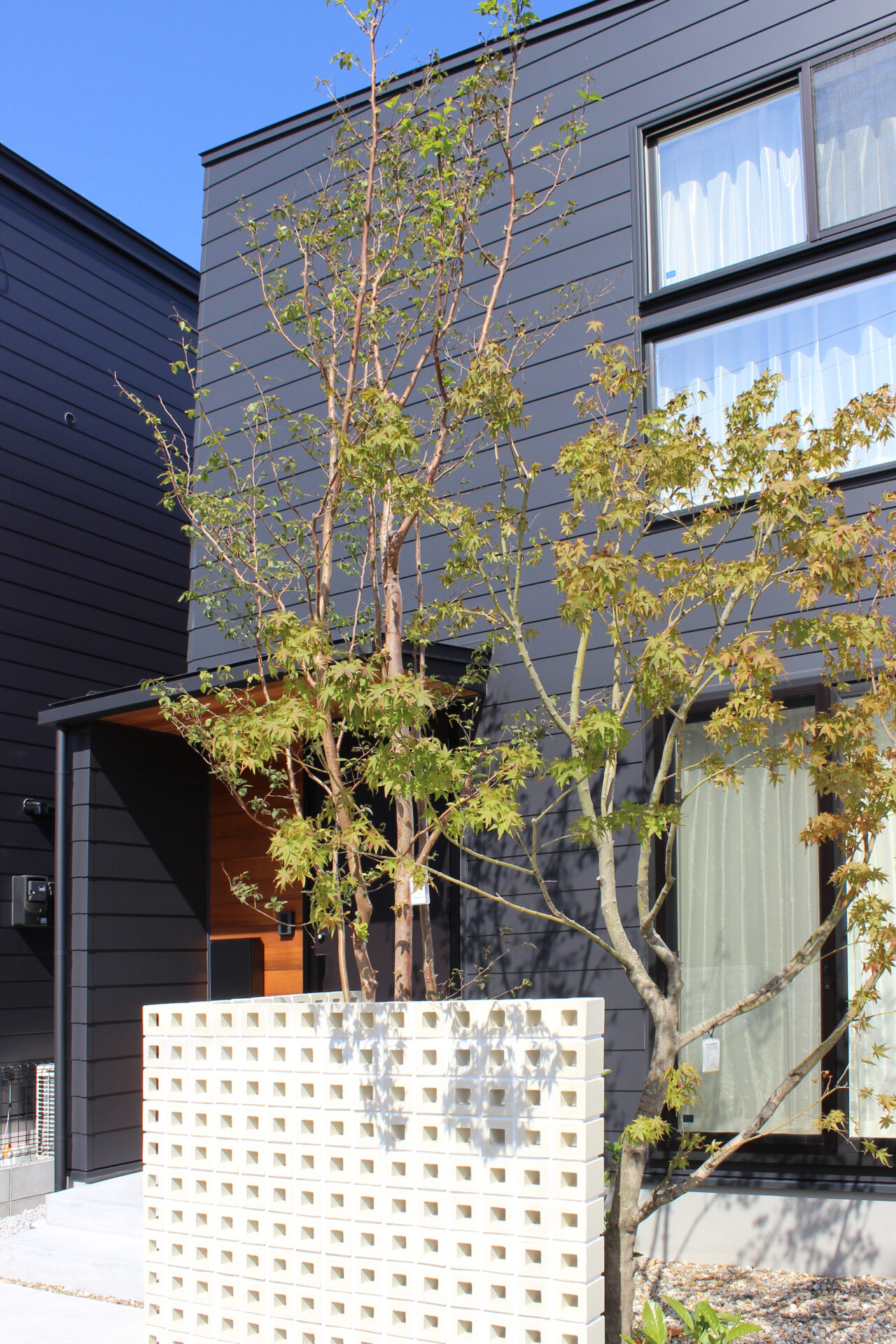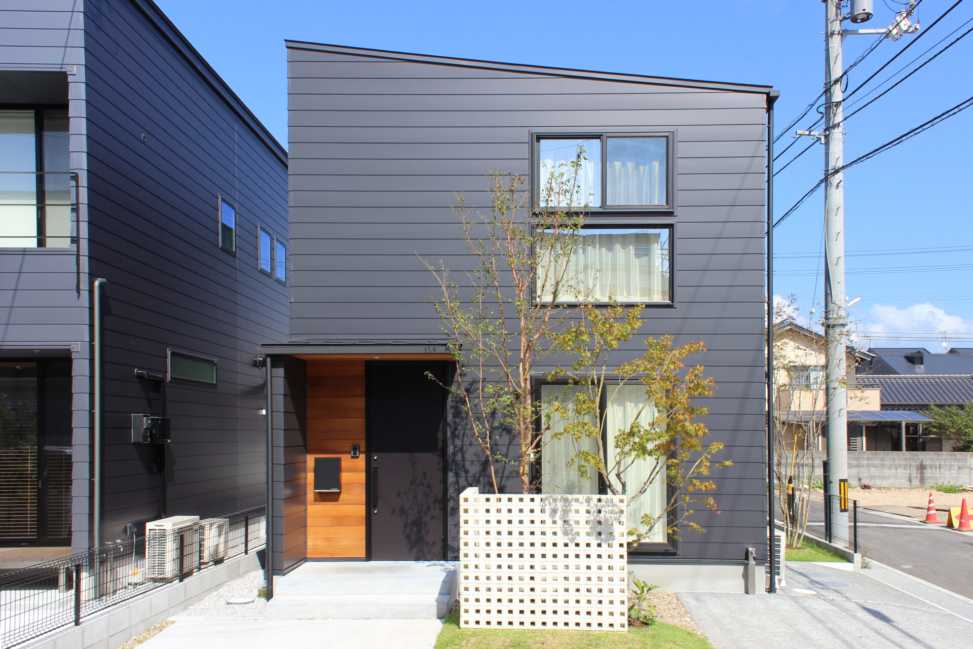 ブラックの外壁に合わせてブラックの玄関扉でまとめたクールな外観。