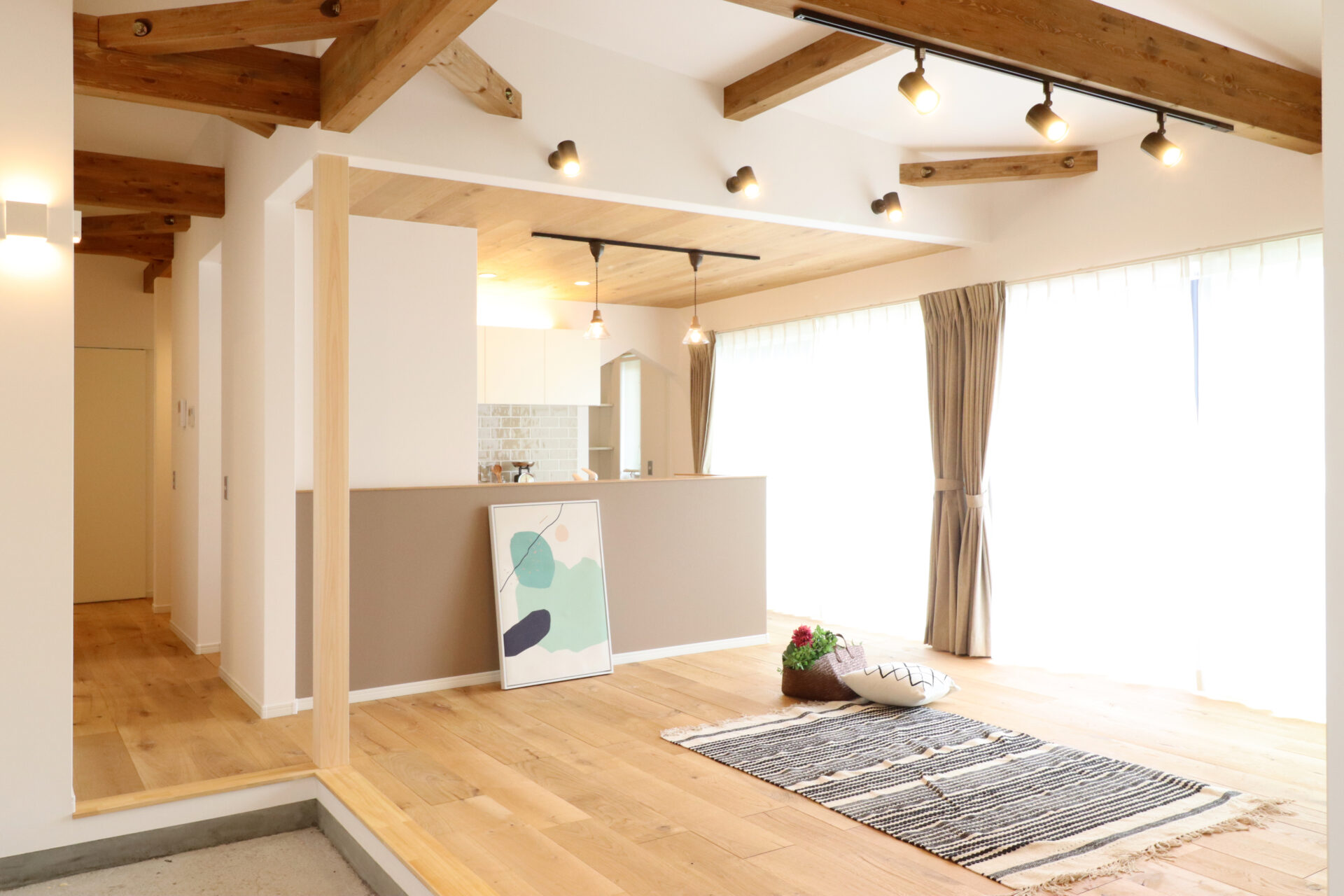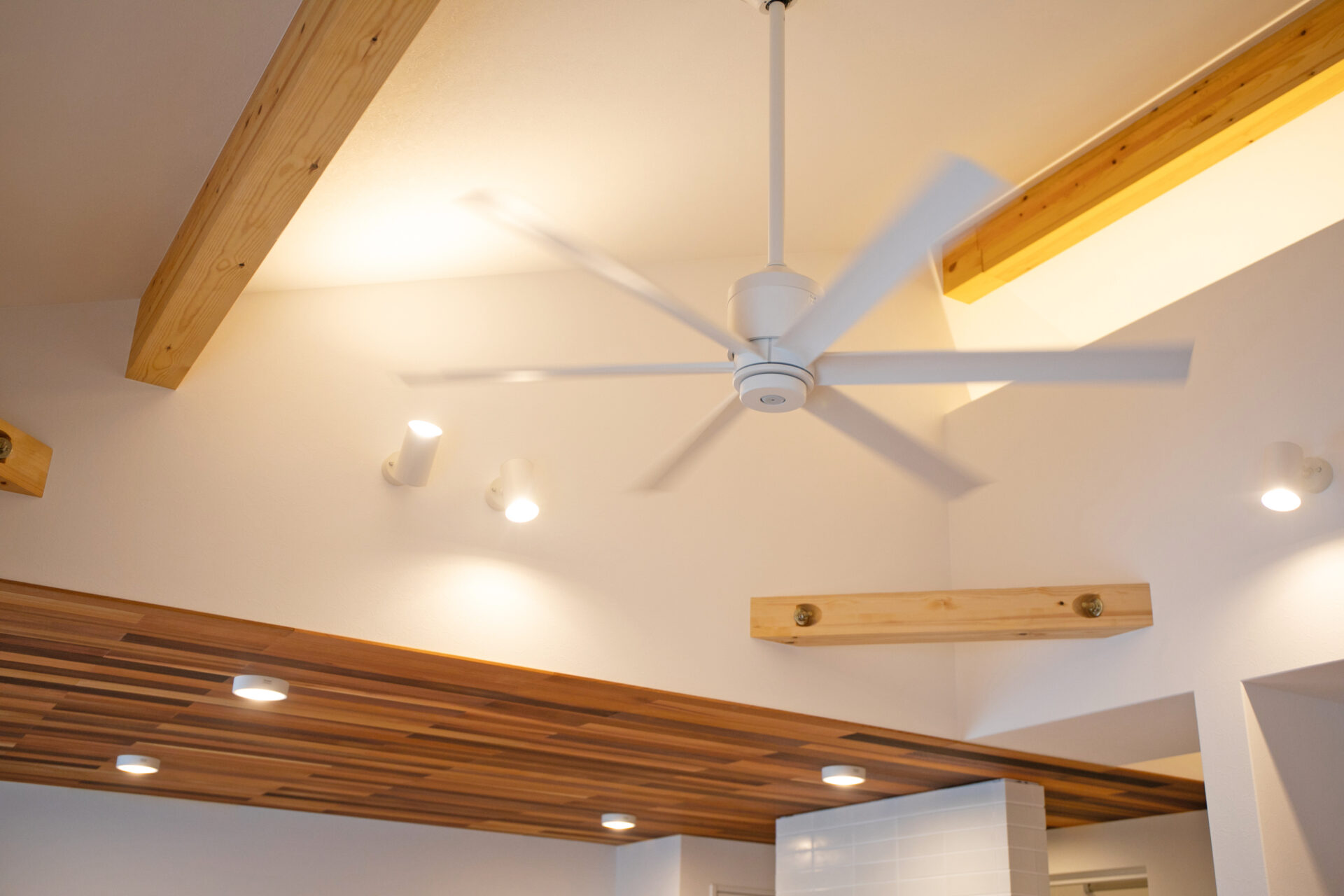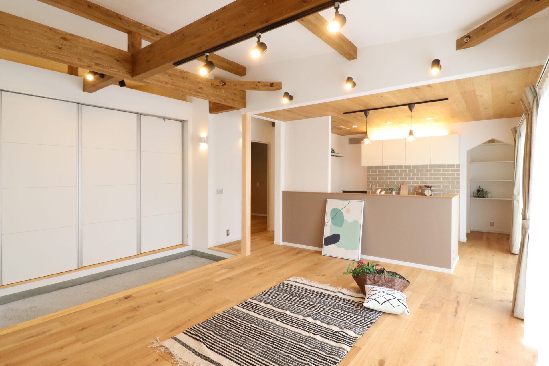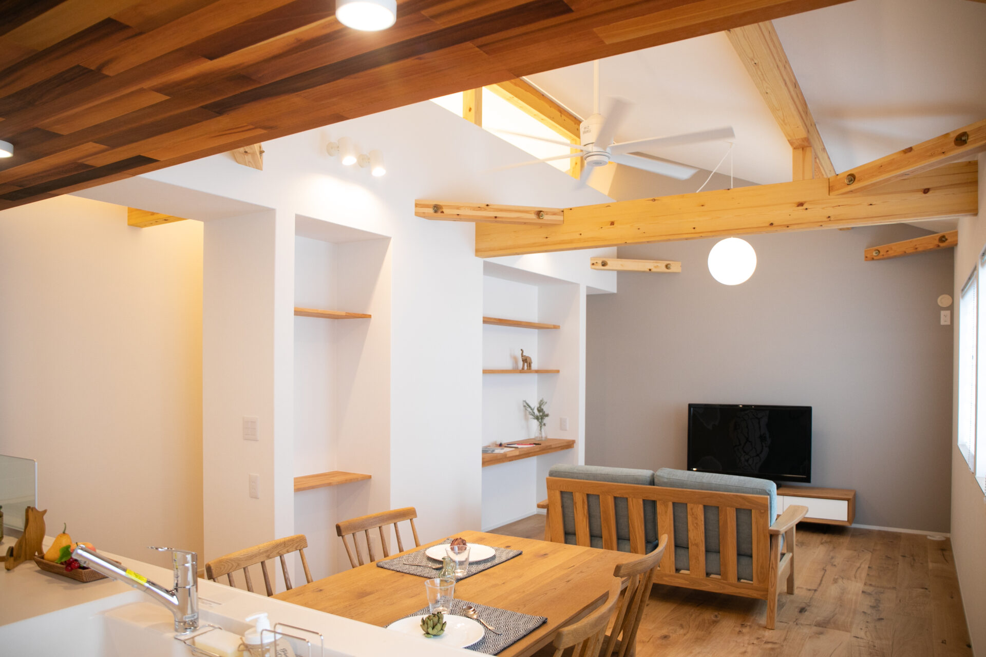 天井の勾配を利用して現しにした梁と間接照明が空間に広がりを感じさせる開放的なLDK。