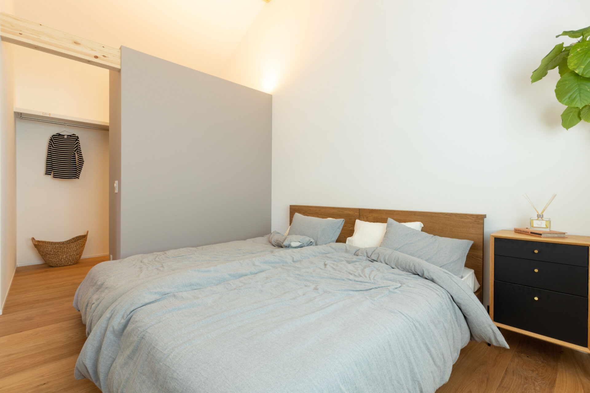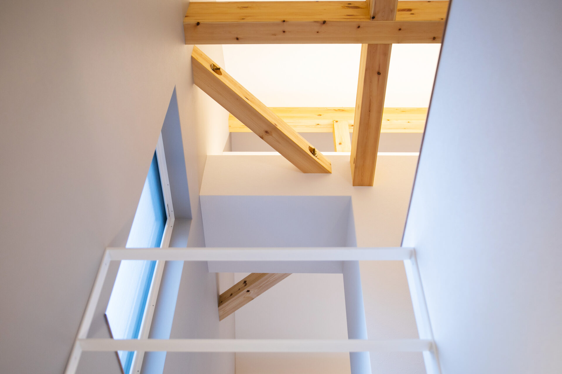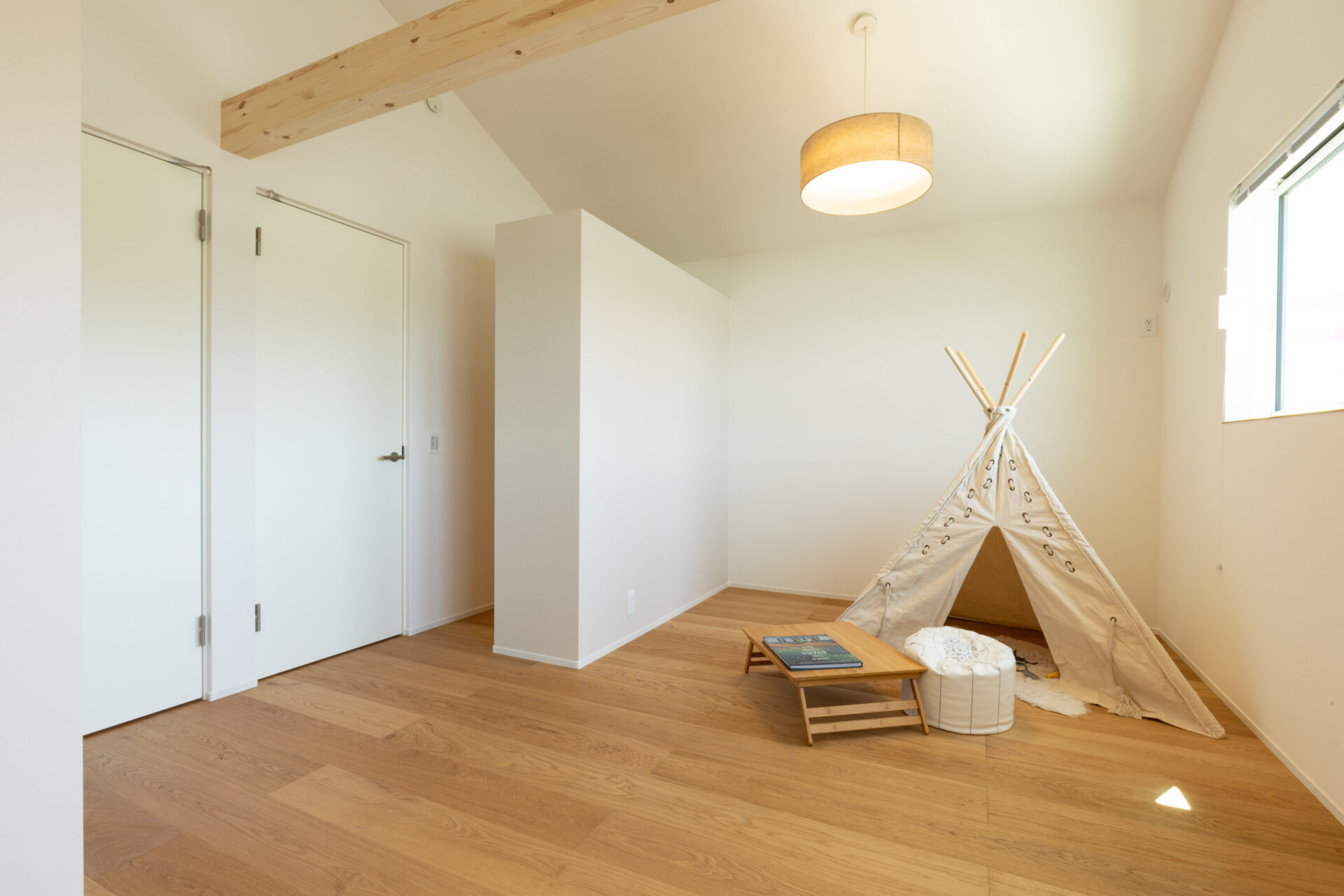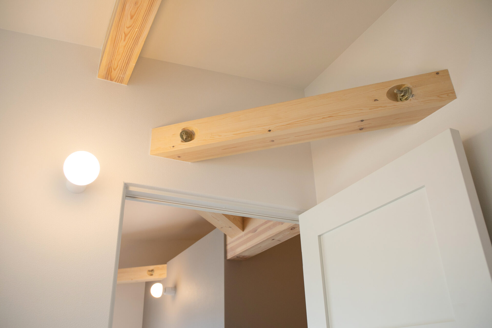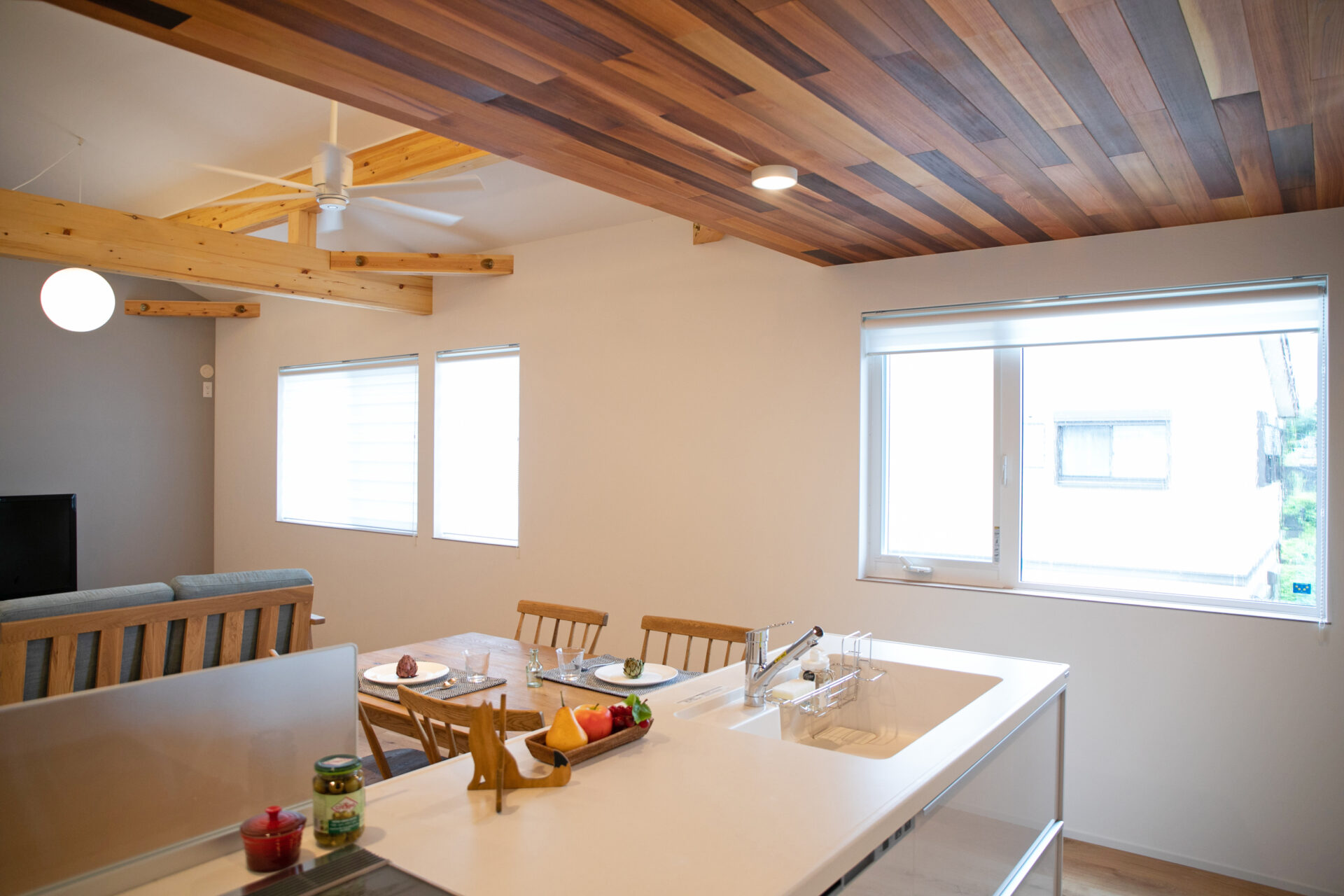 天井の勾配を利用して現しにした梁と間接照明が空間に広がりを感じさせる開放的なLDK。