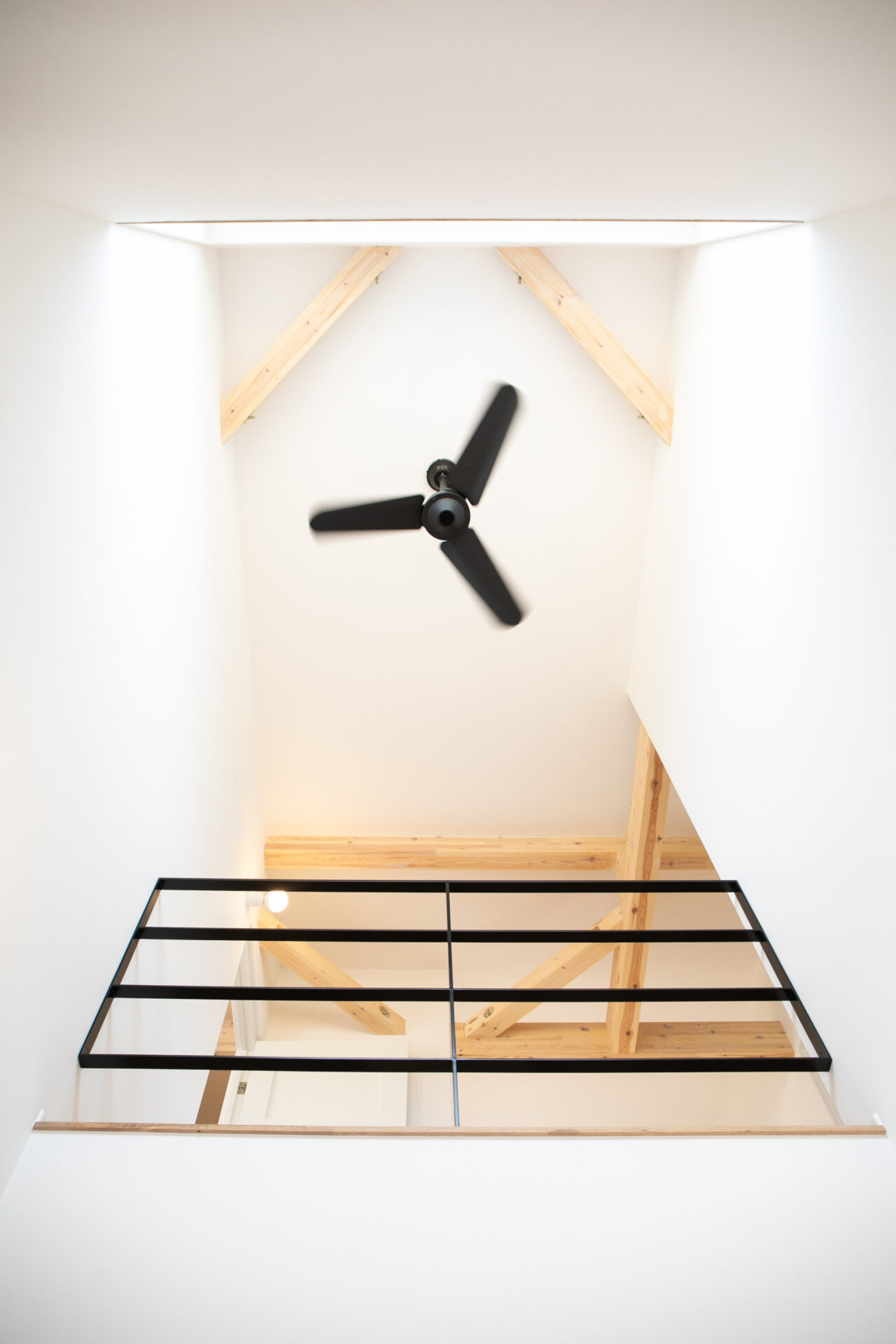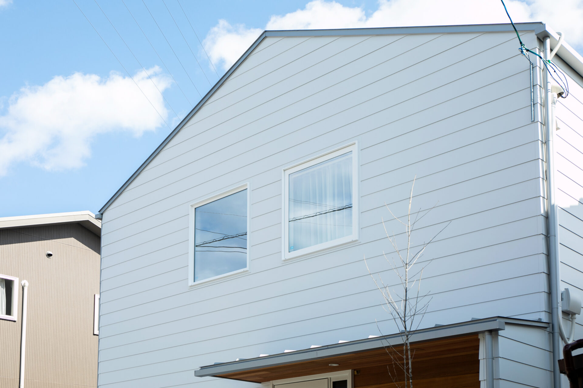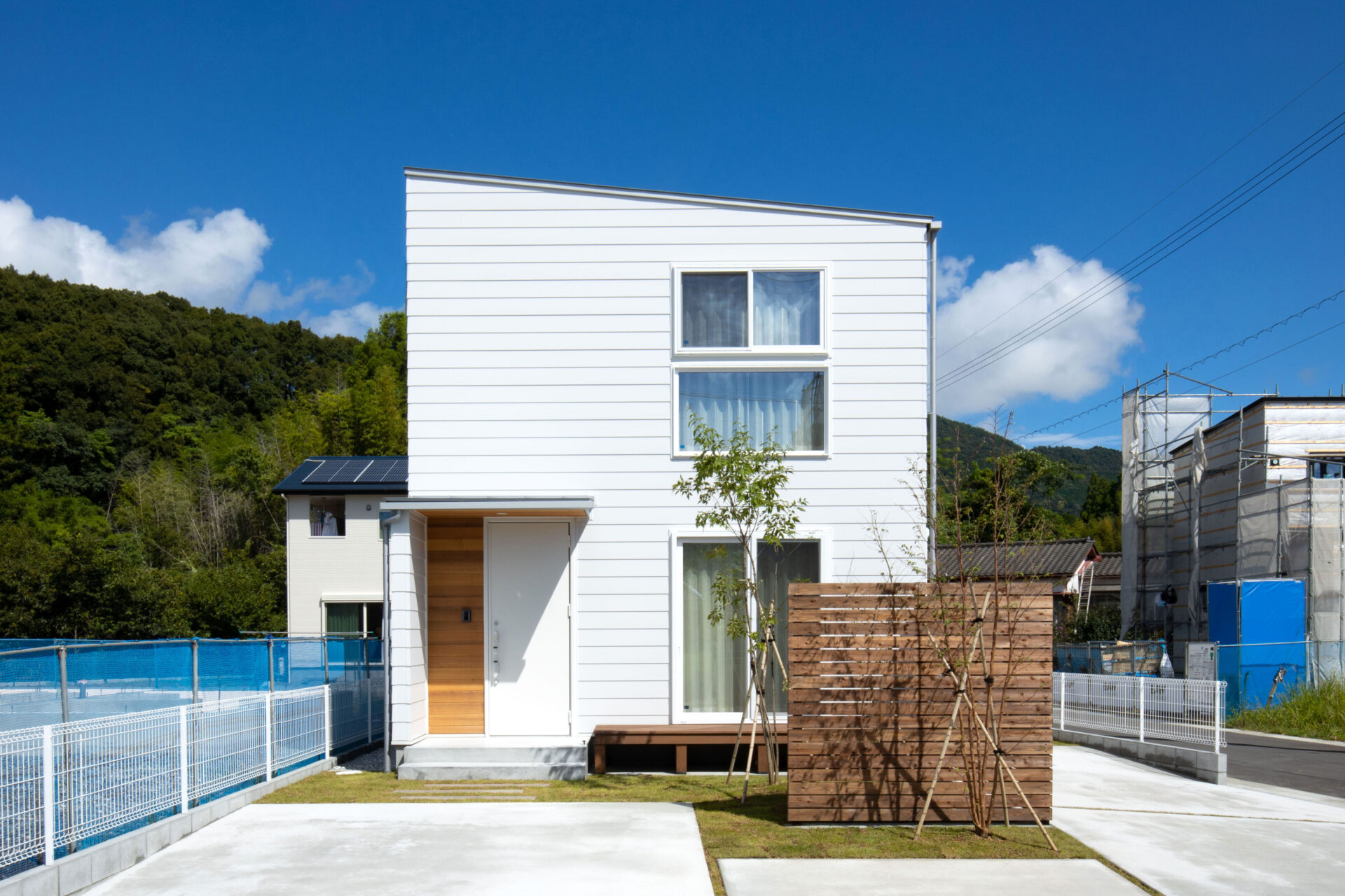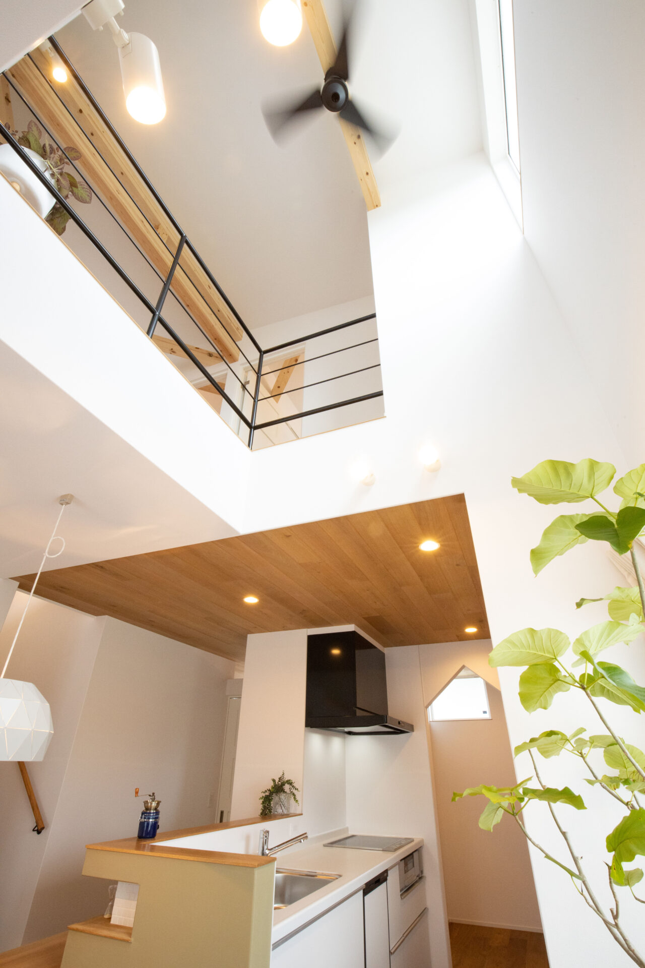 白の外壁が輝くシンプルなSQUAREの家。LDKは窓と吹抜けから光が差し込む明るい空間が広がります。