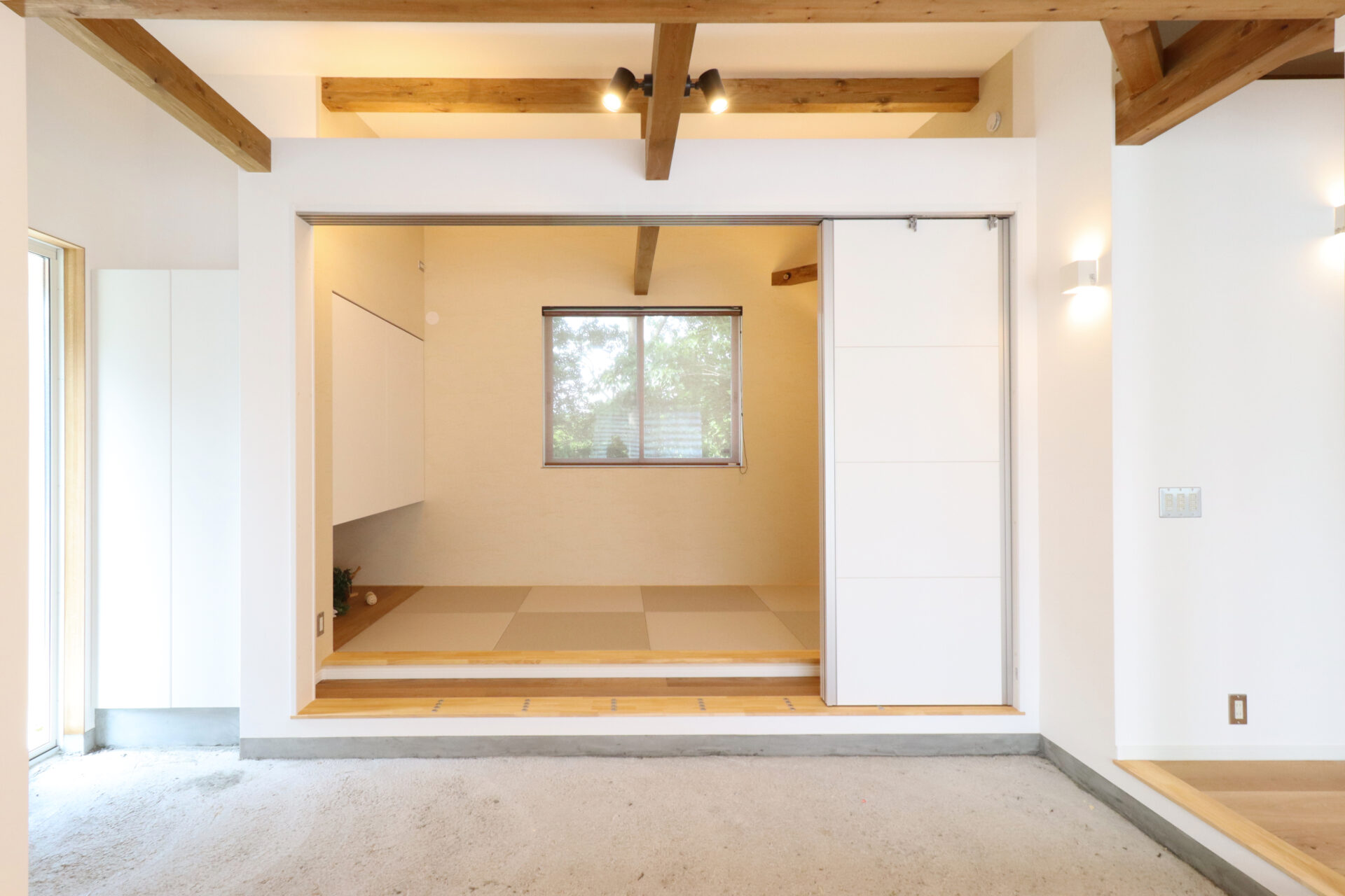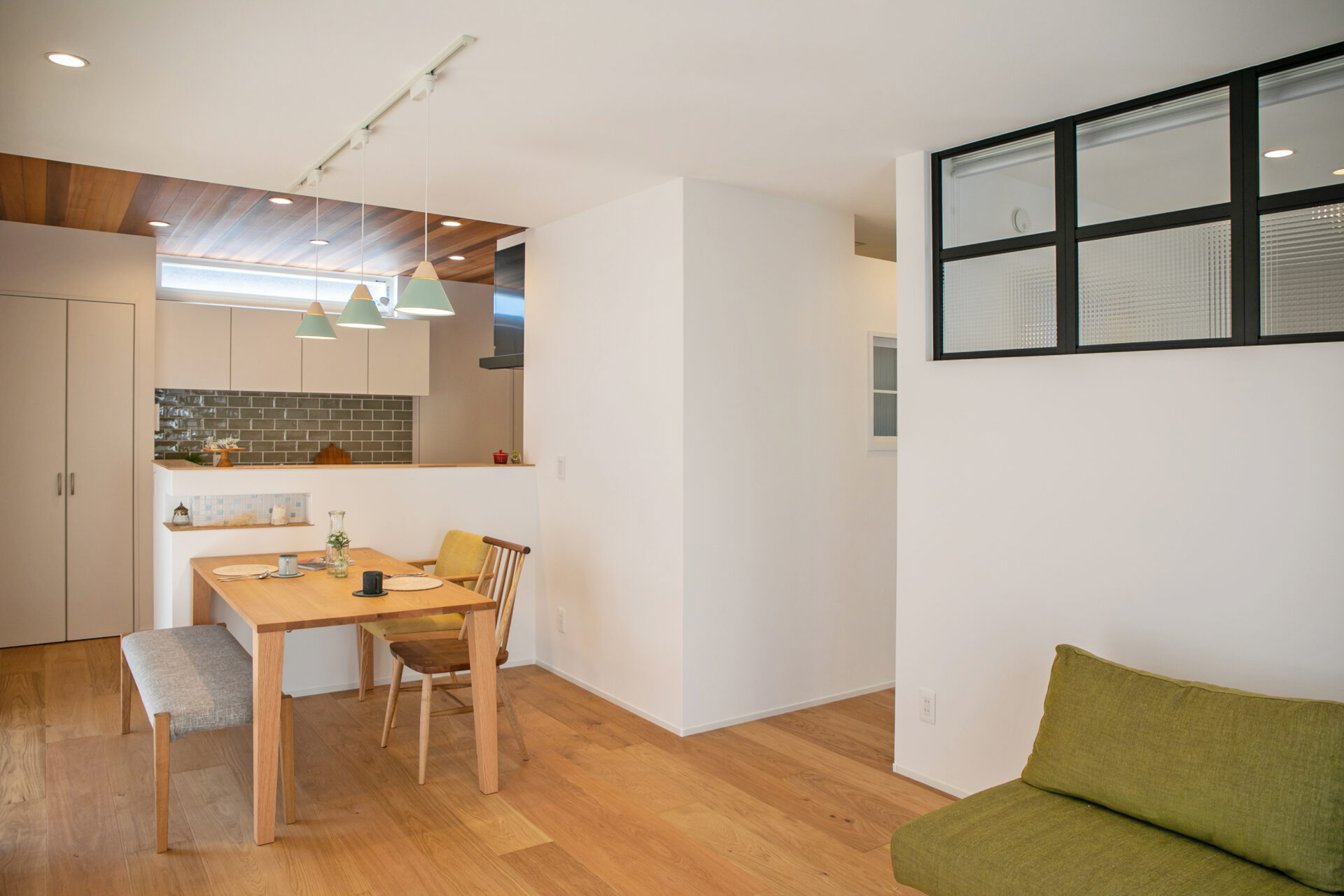 室内窓を上手に取り入れた室内は、家族の気配が感じられる一体感のある空間。