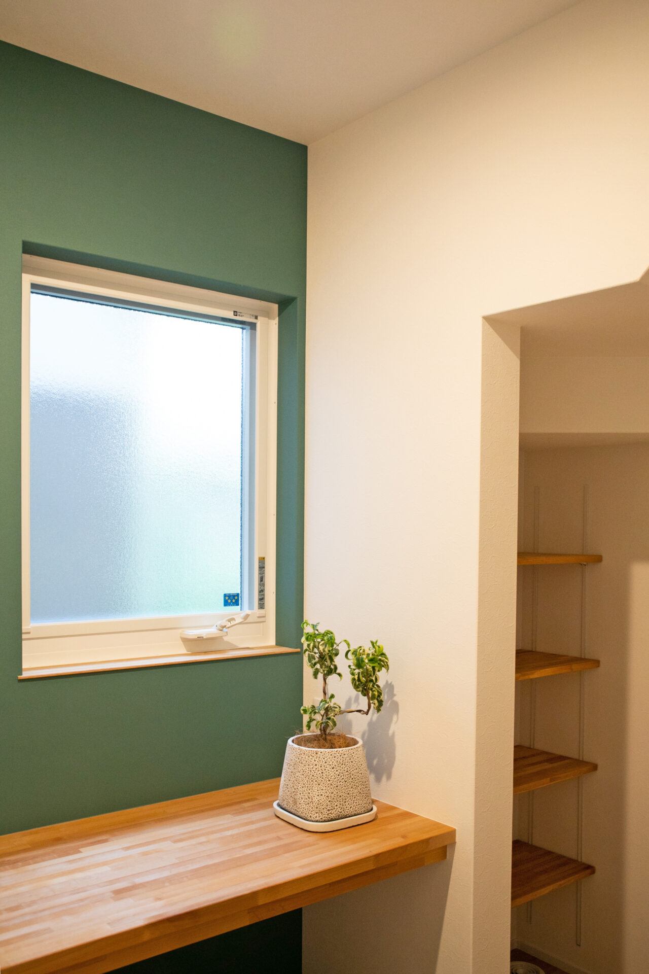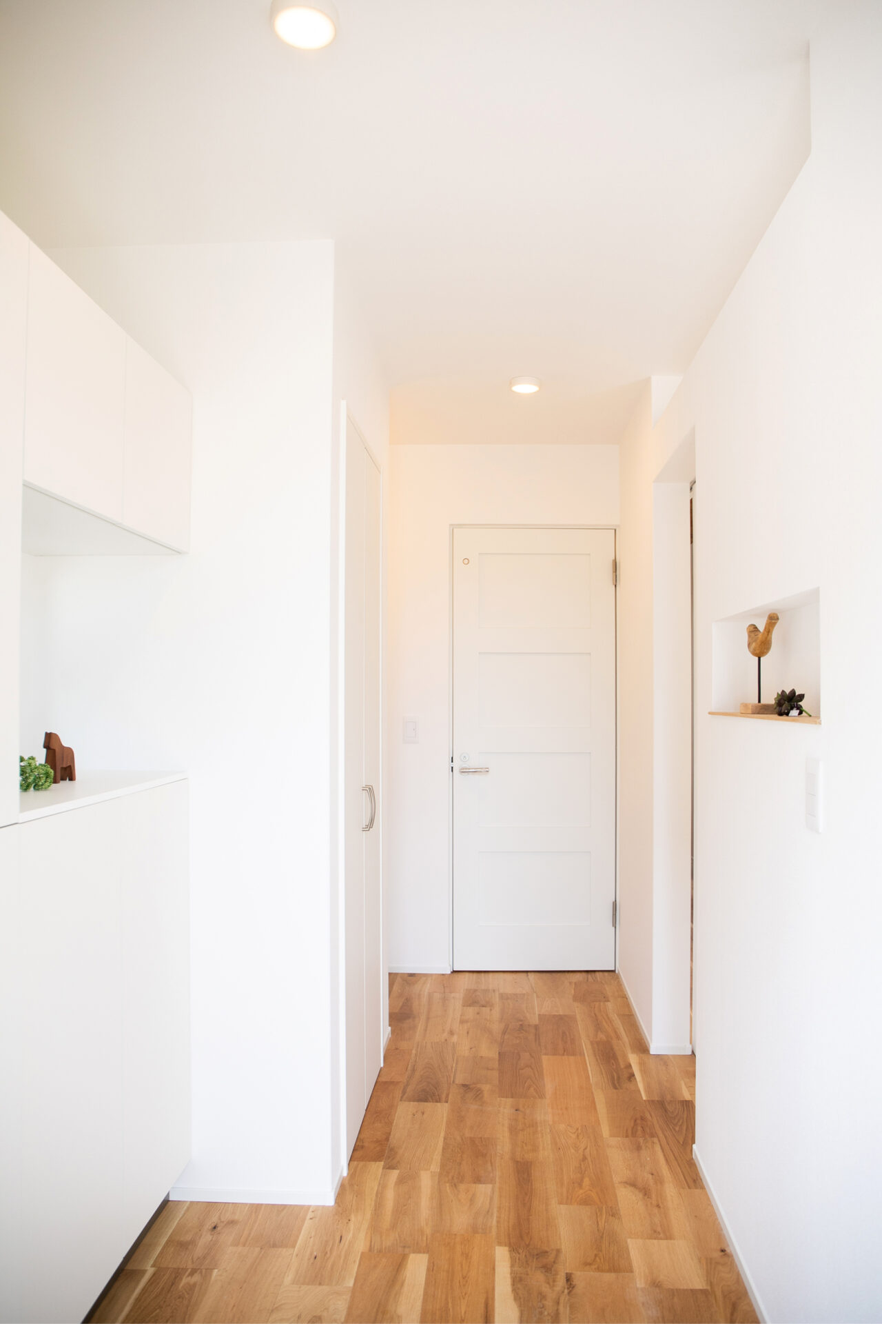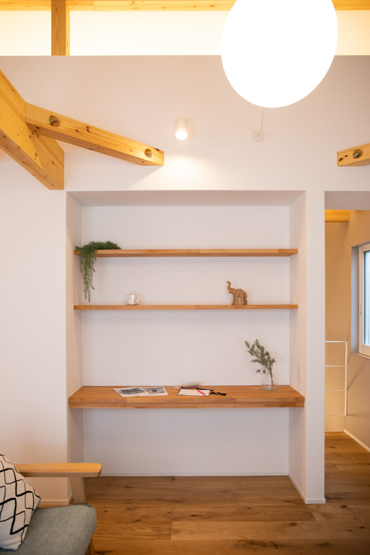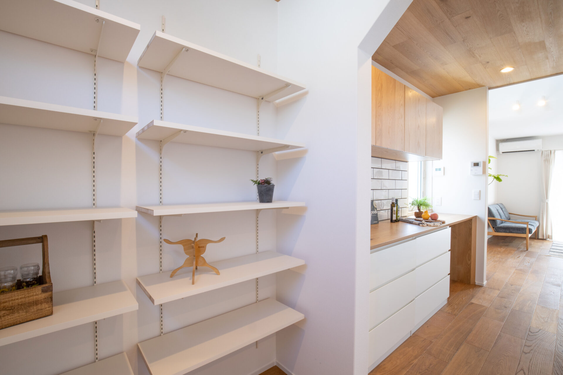 造作の棚や収納で、スッキリと暮らせる住まいです。