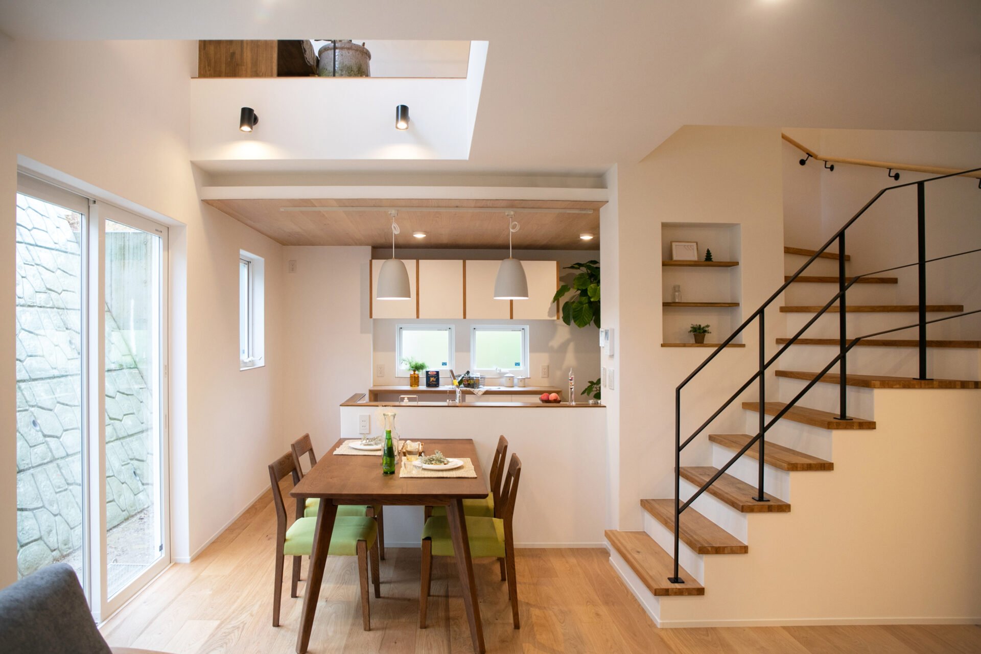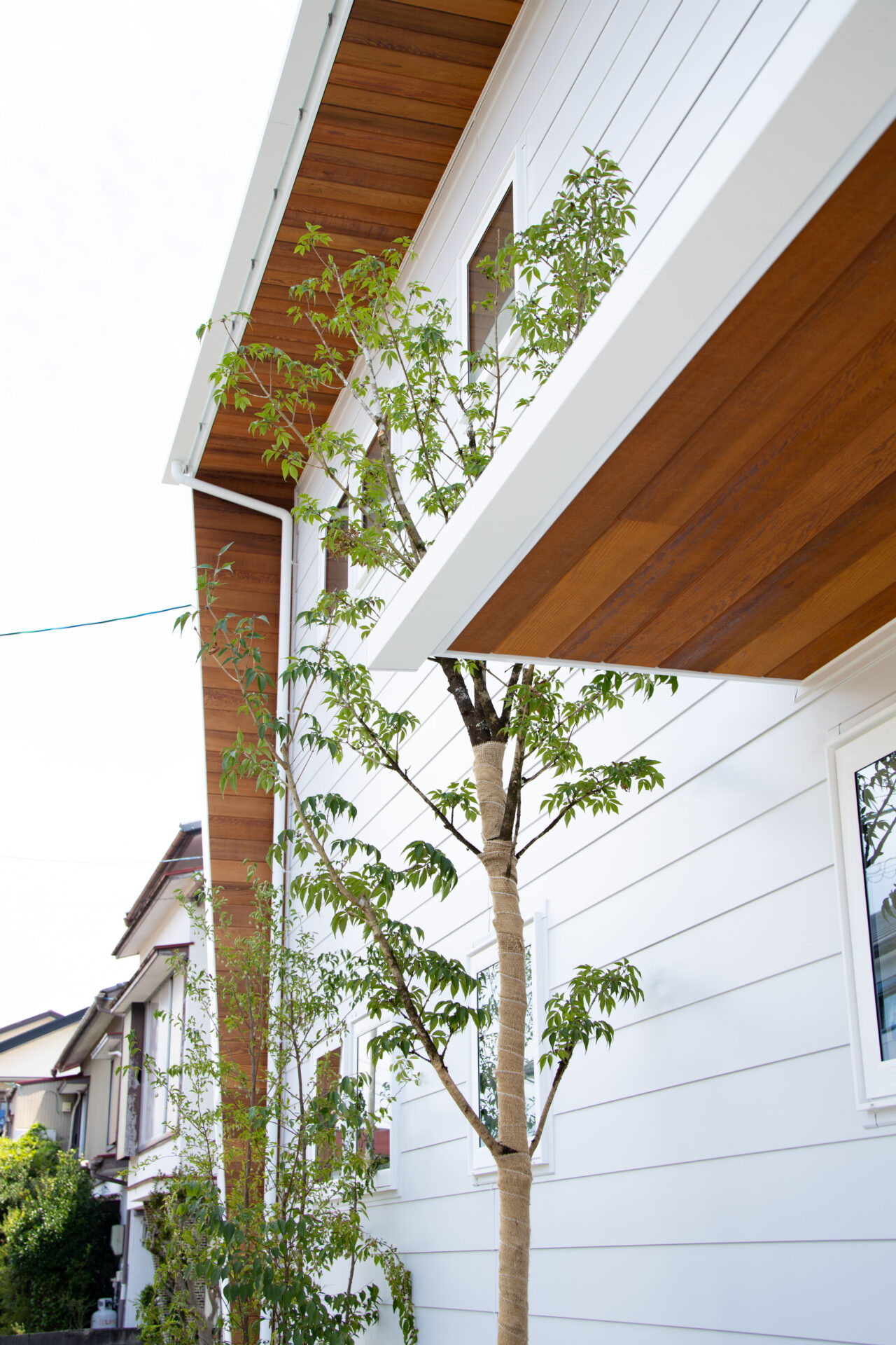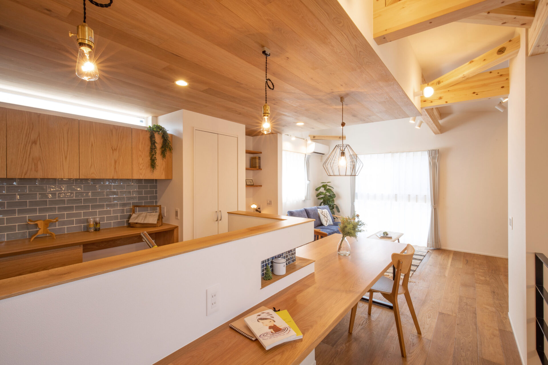軒がオシャレなスタイルの外観。ナチュラルな木のぬくもりが心地よく広がる室内は、広々と明るく開放的。