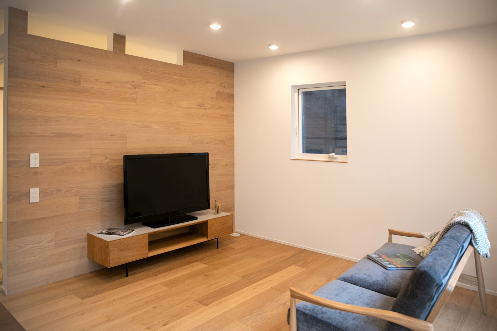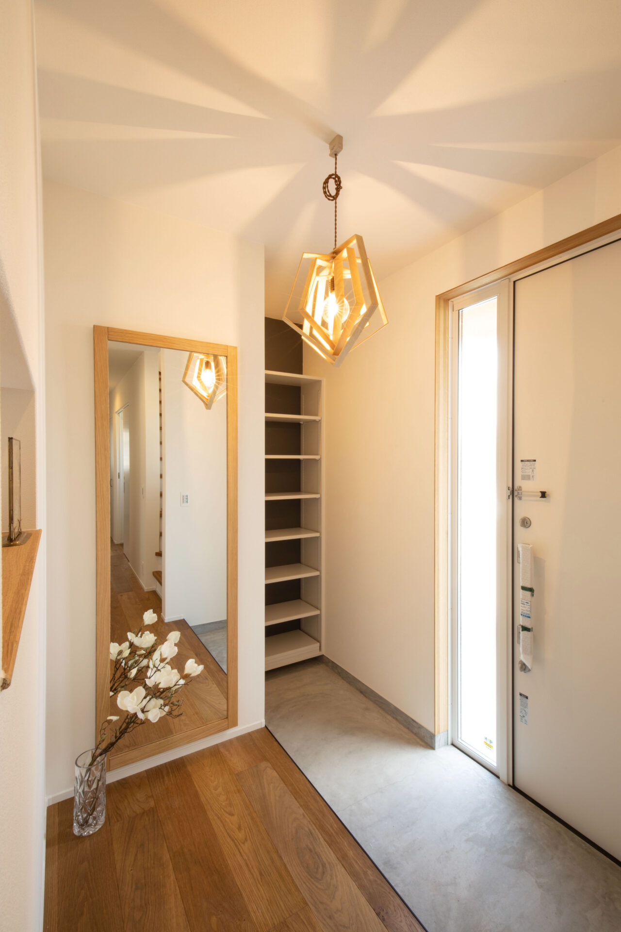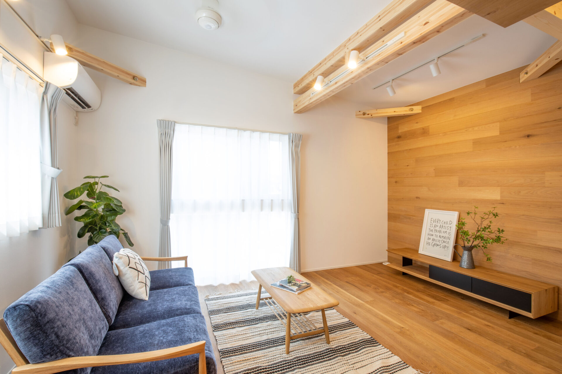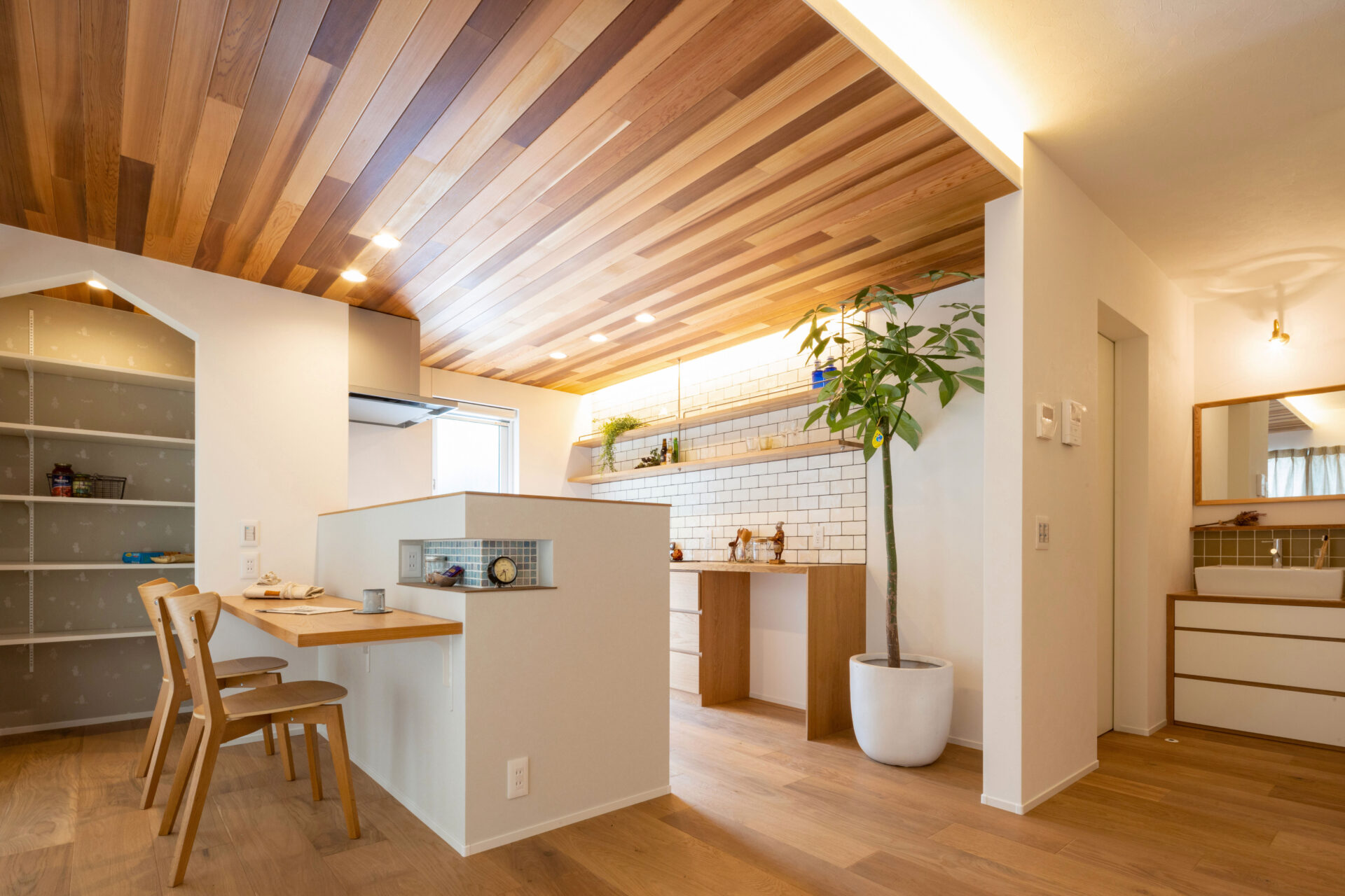 軒がオシャレなスタイルの外観。ナチュラルな木のぬくもりが心地よく広がる室内は、広々と明るく開放的。