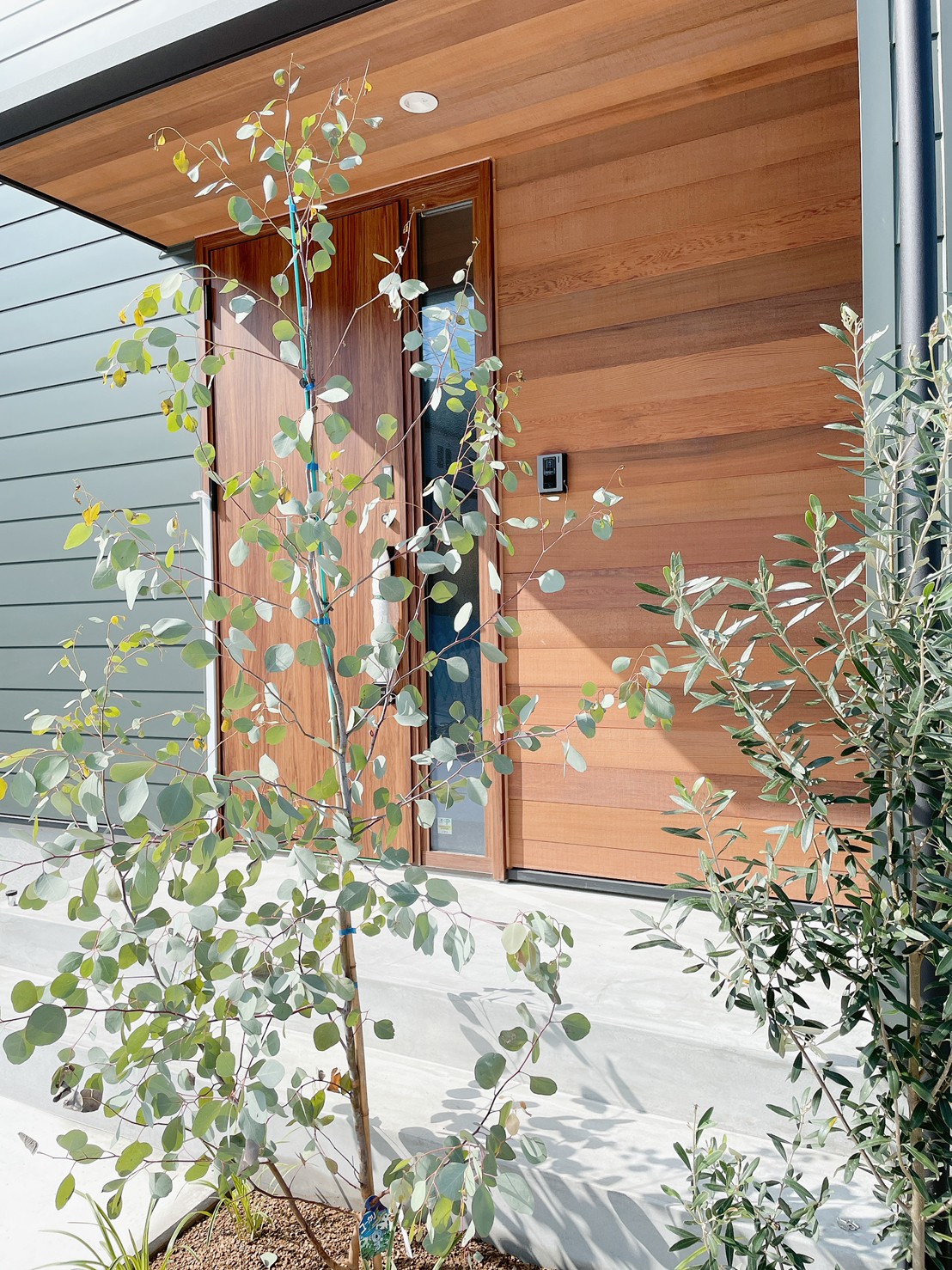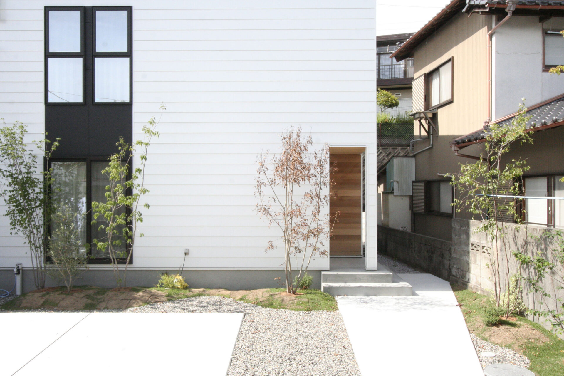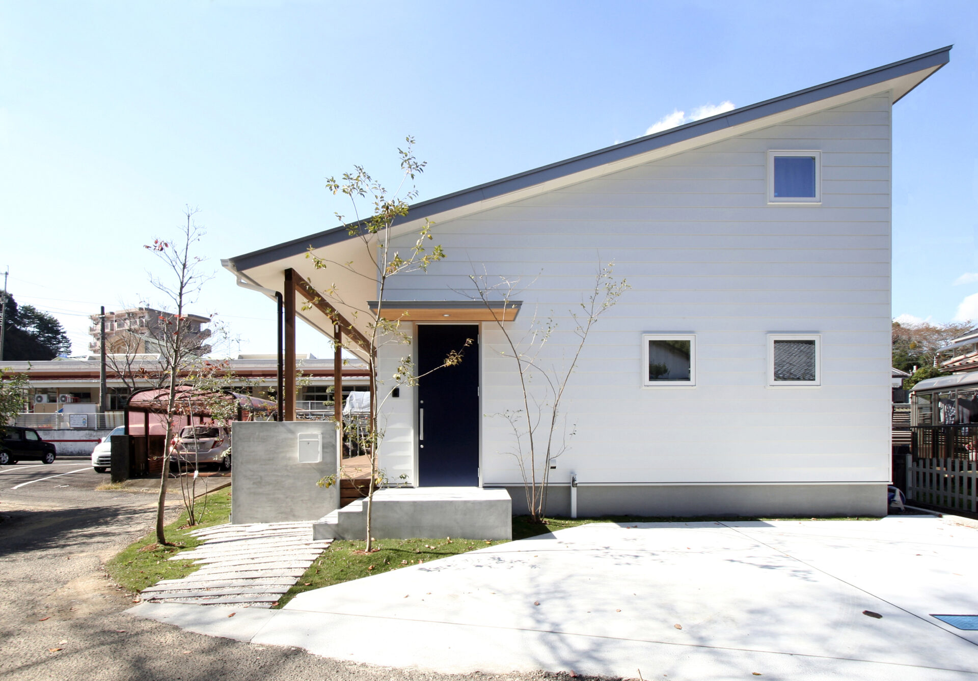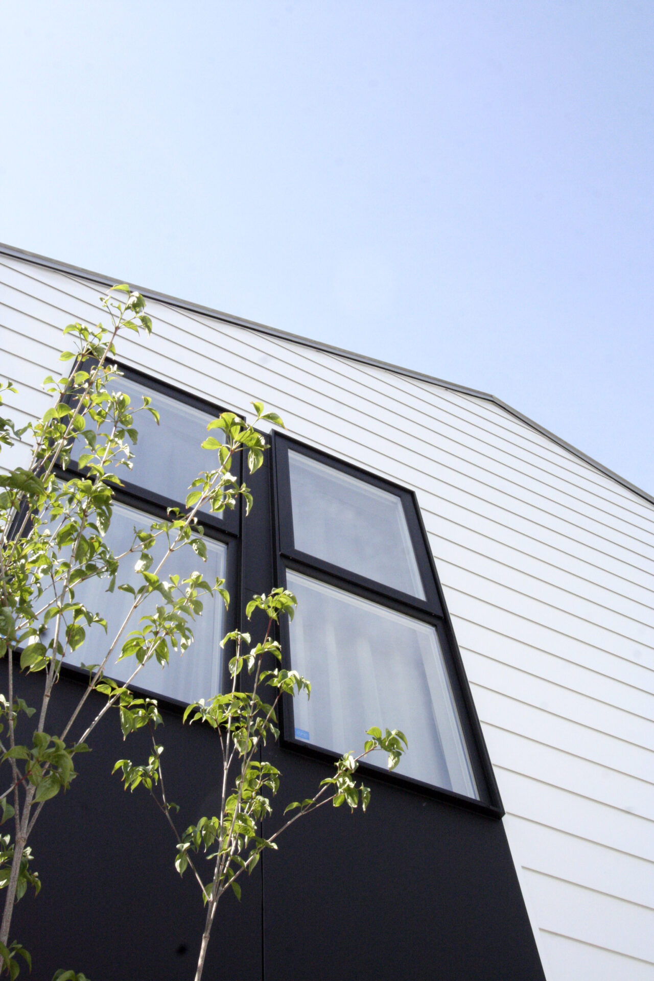 外観はホワイトの外壁にブラックが映えるスタイリッシュなコーディネート。
