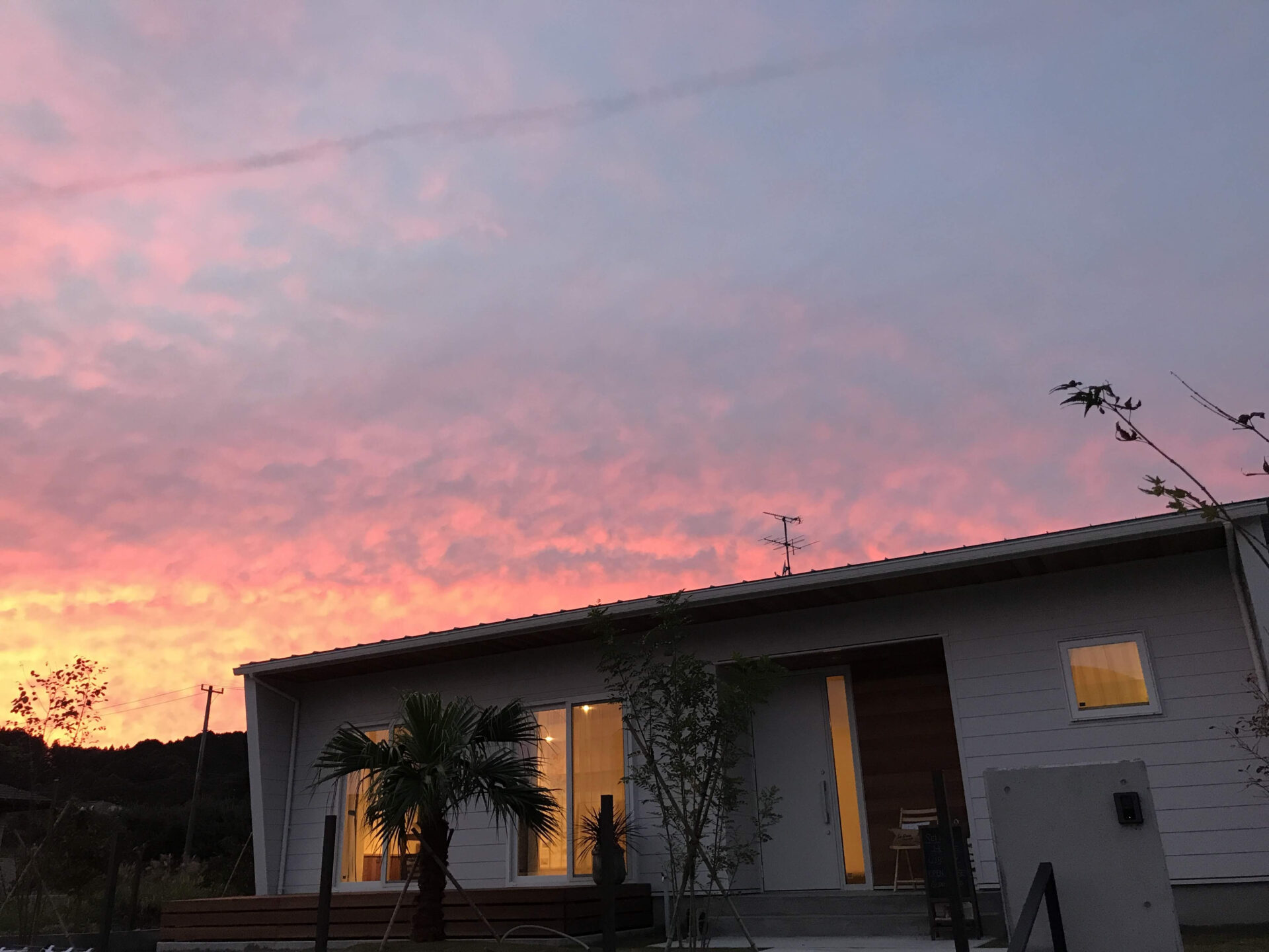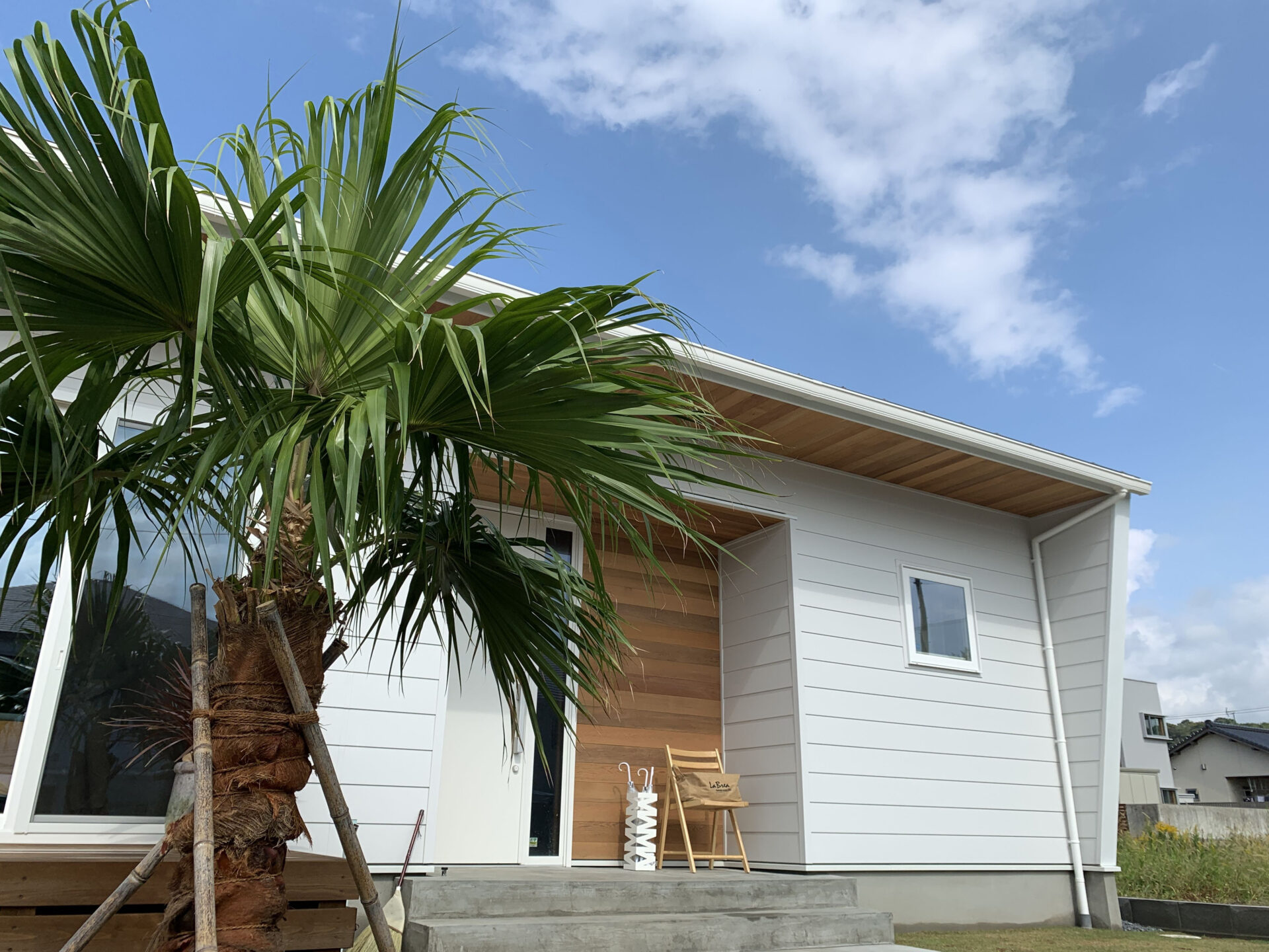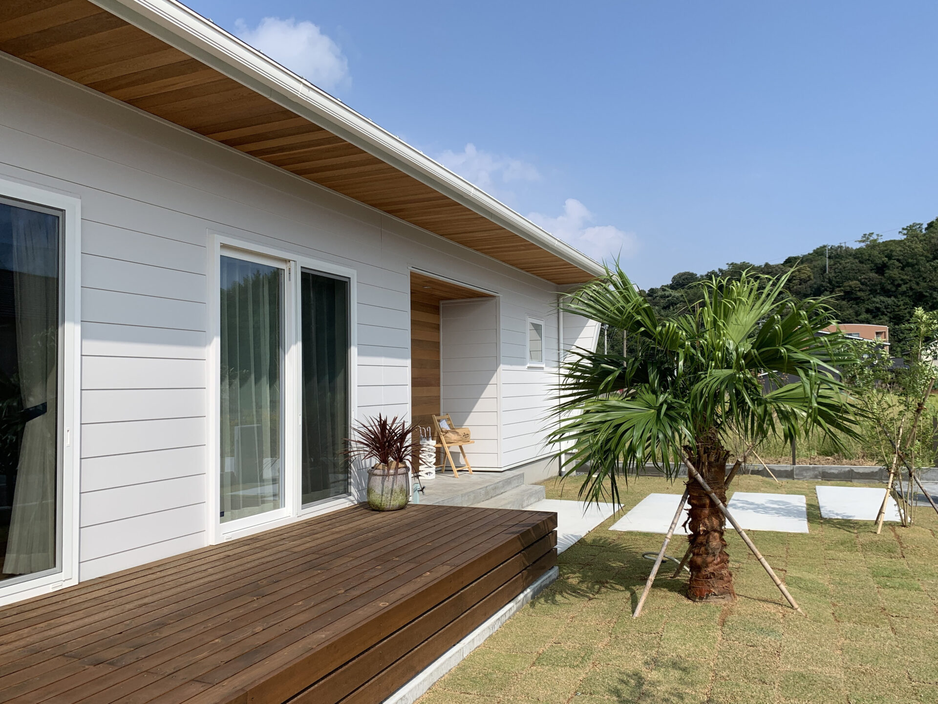 青々とした海や山に似合う外観デザインの家。大屋根の下にある広いウッドデッキでは家族や友人とパーティーを楽しめそう。