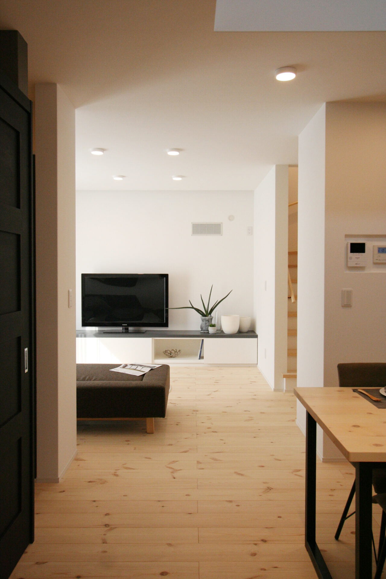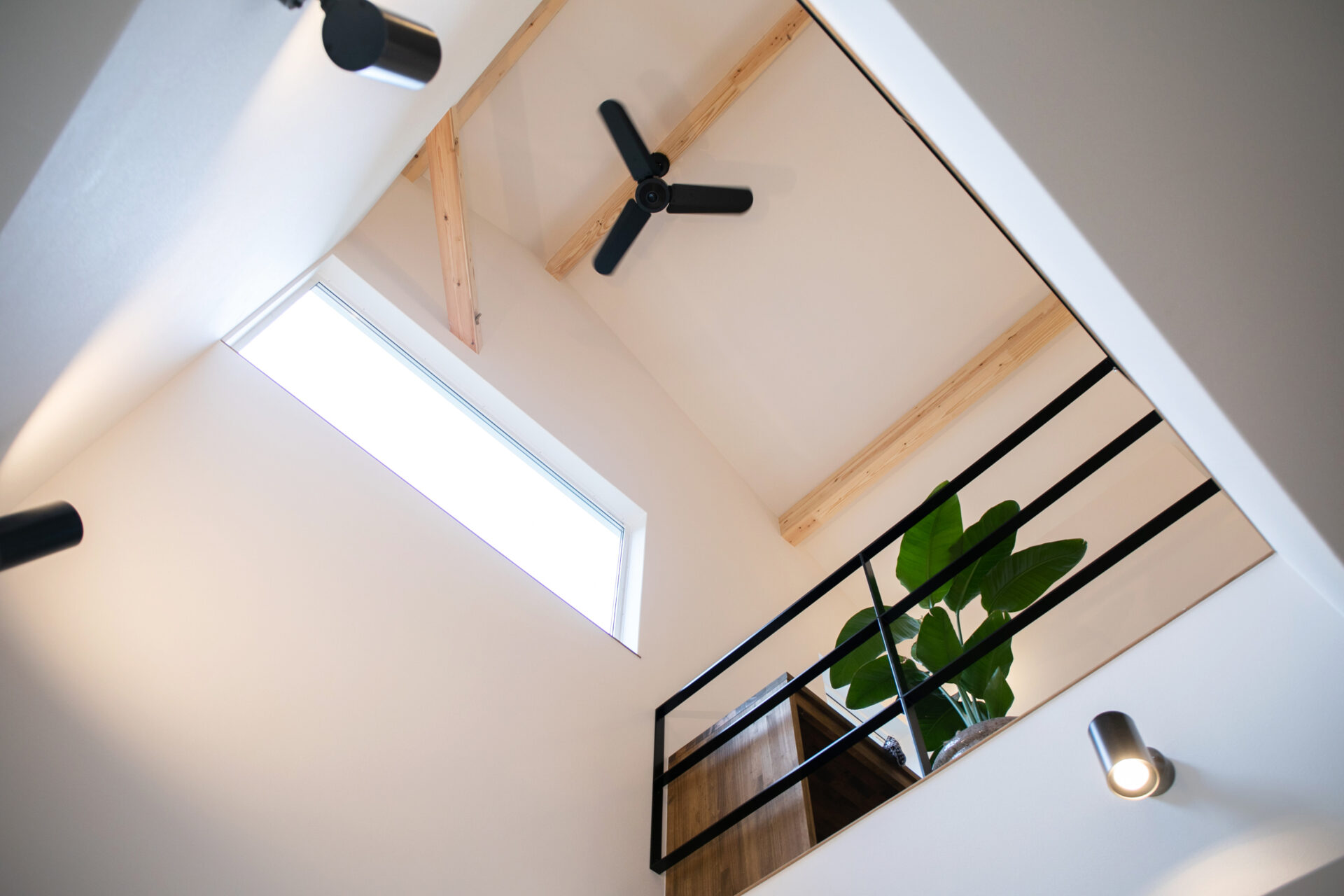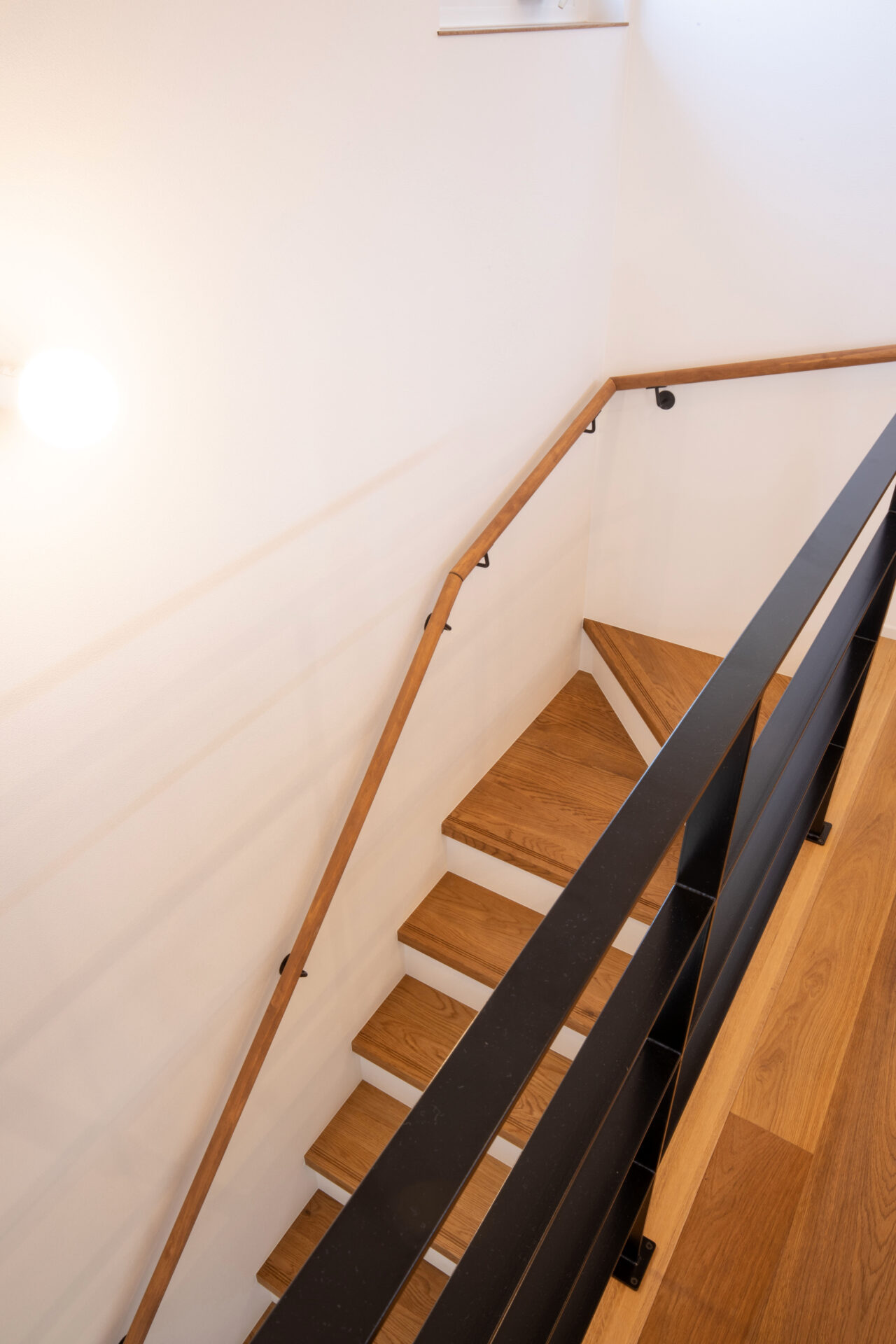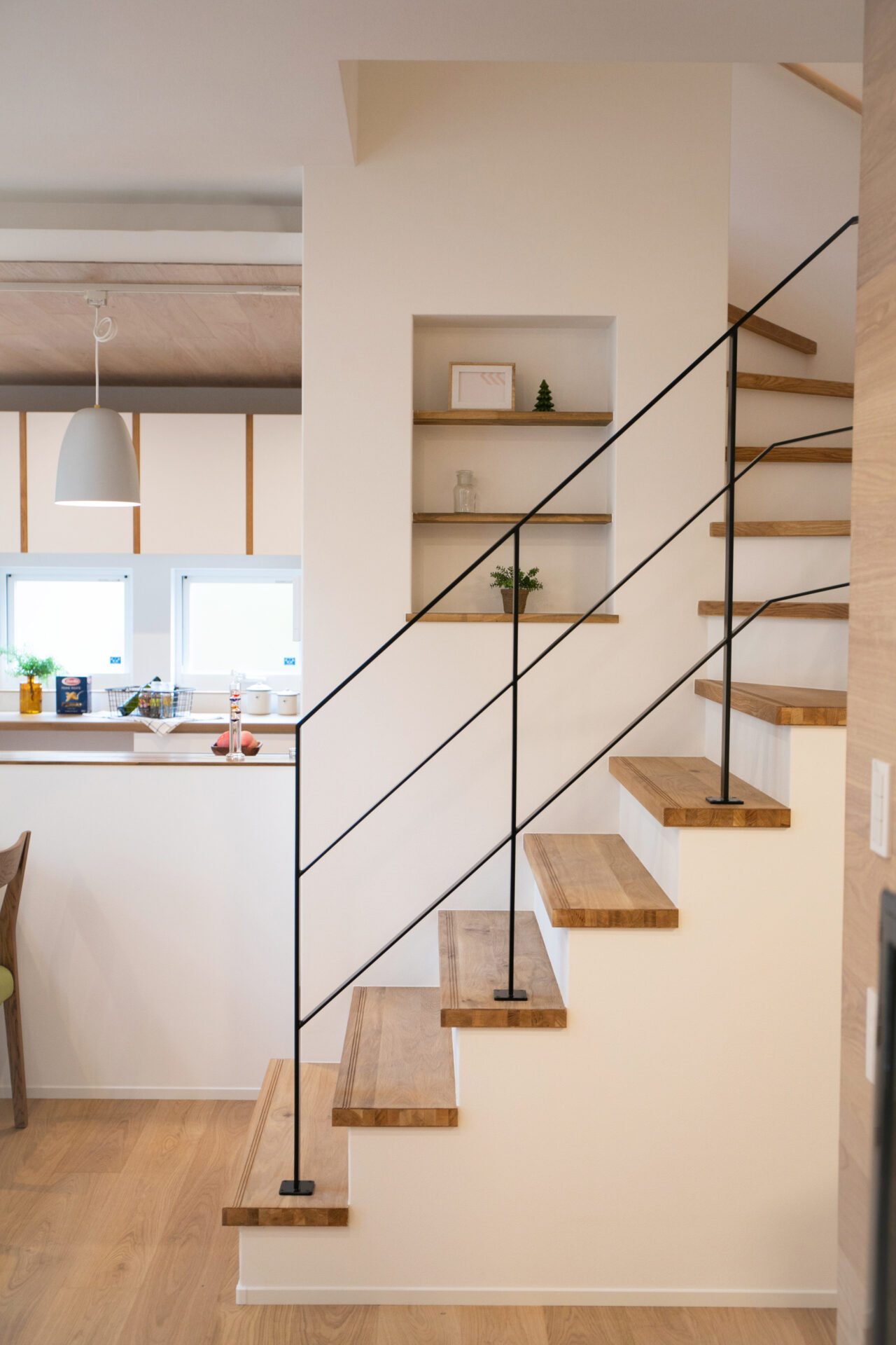 ホワイトと木のインテリアにブラックのアイアン手すりが空間のアクセントになっているナチュラルなLDK。